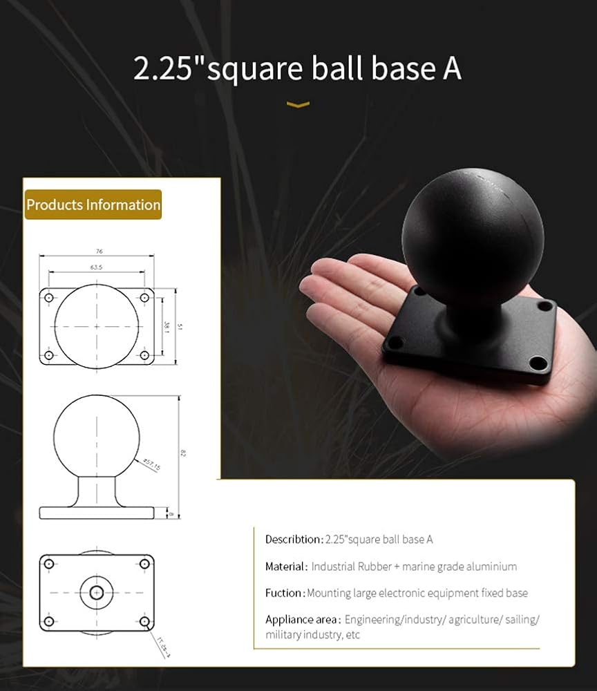 - 2.25 '' Ball Rectangle Base تتميز بنمط Amps القياسي المصنوع من 4 ثقب الذي سيعمل مع جميع لوحات محول AMPS القياسية في الصناعة وتصاعد محددة للمركبة.