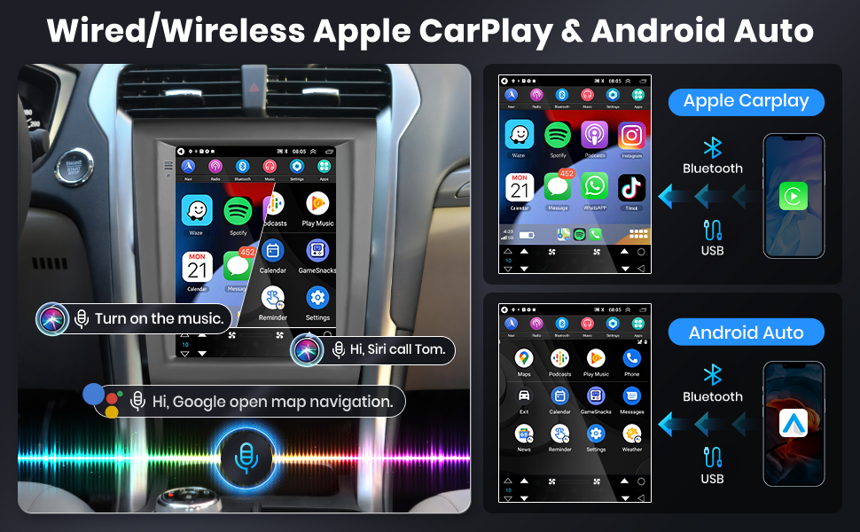 【ستيريو السيارة مع Carplay و Wiredlay و Android Auto】 يمكنك اختيار توصيل ستيريو Ford Mondeo الخاص بك إلى Carplay / Android Auto إما سلكية أو لاسلكية ، وتوصيله بالوصول وغيرها من المعلومات. يمكنك أيضًا استخدام التحكم الصوتي ، وهي طريقة أكثر أمانًا وأسرع لضمان السلامة على الطريق.
