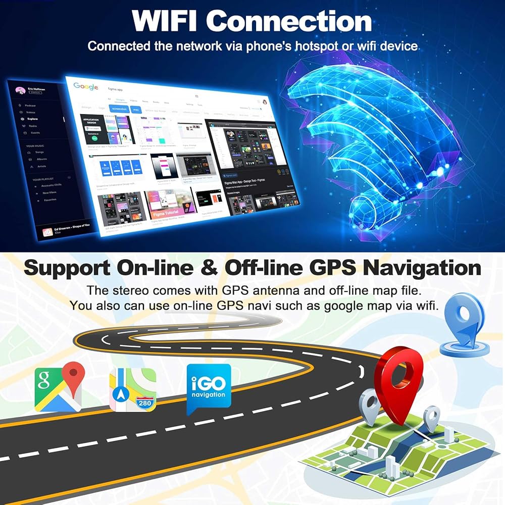 【GPS Navigation & WiFi】 وحدة GPS Head وحدة GPS المدمجة في GPS وهوائي GPS الخارجي للتنقل عبر الإنترنت أو غير متصل بالإنترنت. يتم تحميل بيانات الخريطة المتصلة بالإنترنت مسبقًا ، وعلى استعداد للاستخدام بعد التثبيت ، وتشمل الصوت والبصري بدوره 11 مليون مكتبة+ POI ، والطرق ثنائية وثلاثية الأبعاد ، وتتبع الوقود. يدعم راديو السيارة أيضًا اتصال WiFi Hotspot ، ويمكنك بسهولة الوصول إلى تطبيقات التنقل عبر الإنترنت وتنزيلها ، و Instagram ، و Facebook ، و Tiktok ، وما إلى ذلك في متجر Play.