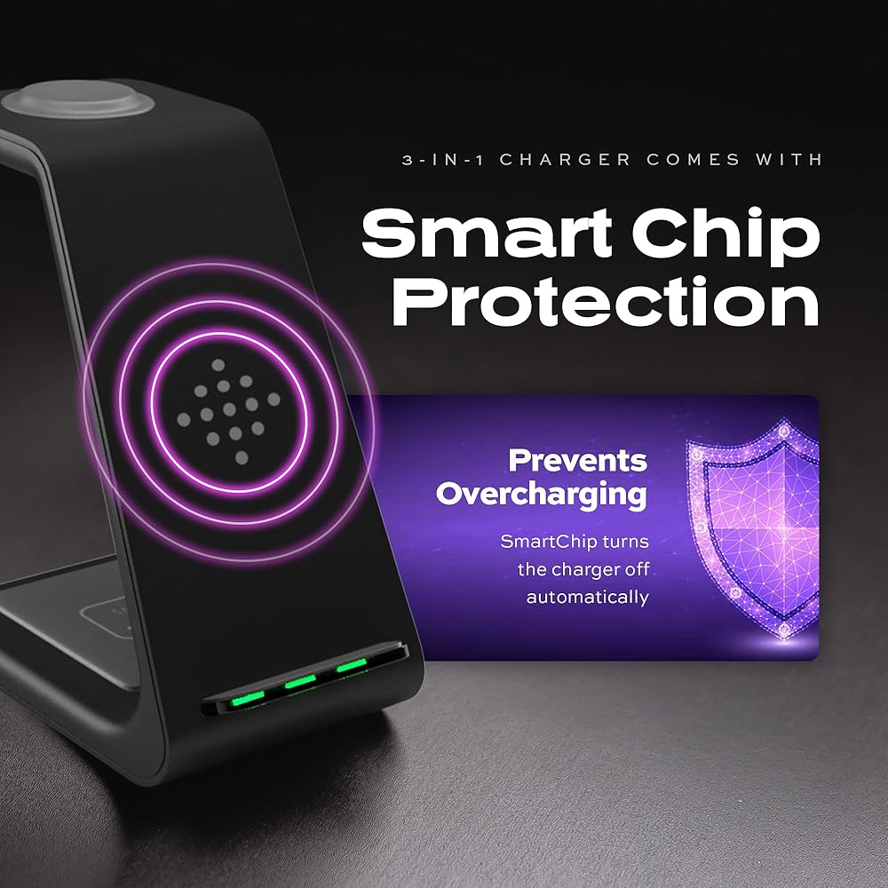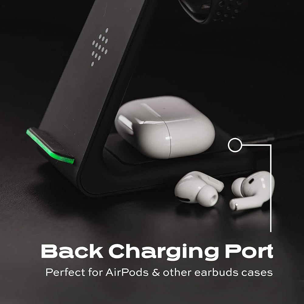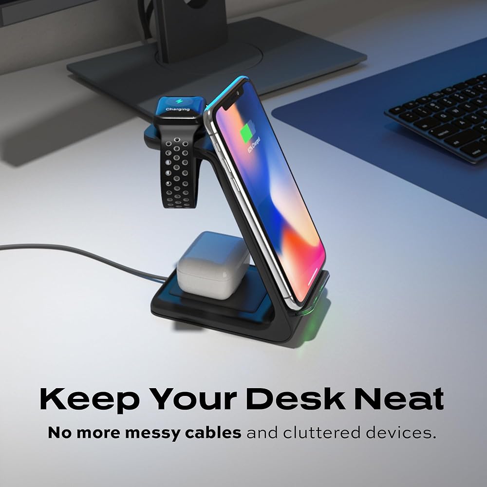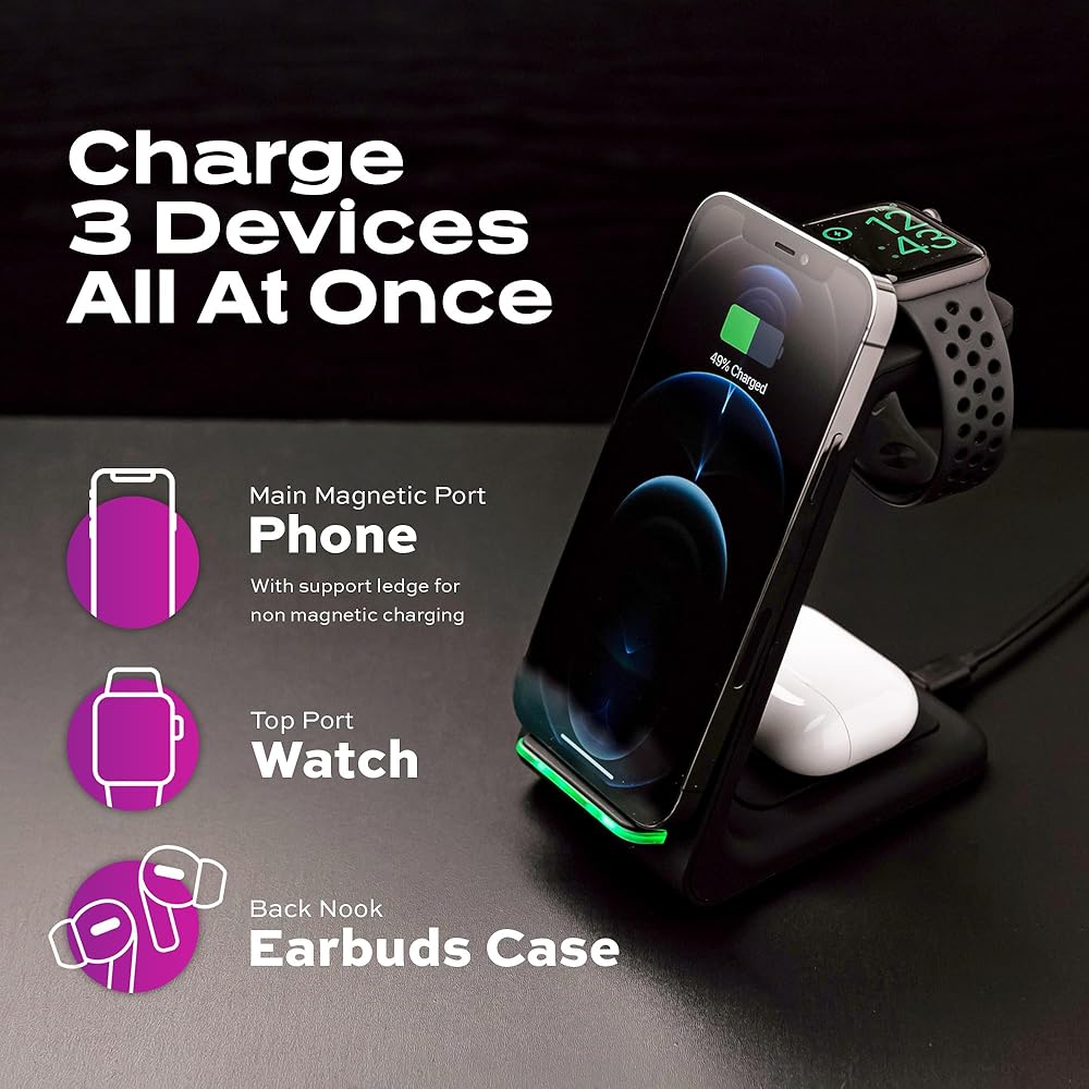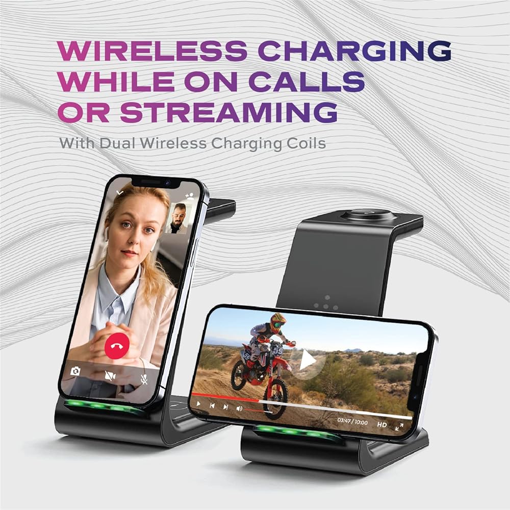 في نفس الوقت ، فرض رسوم على أجهزتك بشكل أسرع-الشاحن اللاسلكي Statik 3-in-1 هو رصيف شحن لاسلكي عالي السرعة 10 واط. هذا يعني أنه يمكنك شحن أدواتك 2x بشكل أسرع من شاحن الهاتف المعتاد 5W. بالإضافة إلى ذلك ، يتيح لك حامل الشحن اللاسلكي الخاص بنا شحن هاتفك ومشاهدتك وسماعات الأذن في نفس الوقت. غير متوافق مع ساعات Samsung