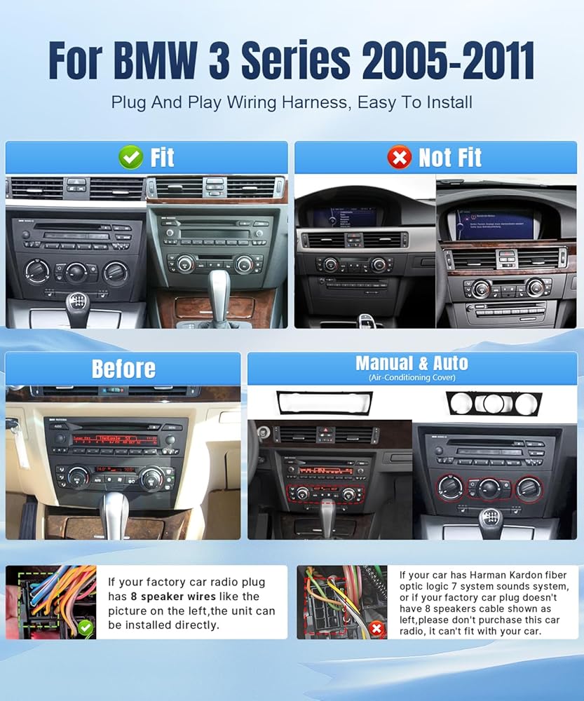 ملاحظة: 1. إذا لم يكن 8 أسلاك أو مجهزة بنظام منطق 7 ، فإنه يحتاج إلى مربع وحدة فك الترميز إضافية للتثبيت (غير مضمّن). الرجاء اختيار بعناية. 2. قد إلى صغر حجم راديو الأسهم في E90-E93 ، يجب نقل لوحة التحكم A/C للأسهم إلى موقع صندوق تخزين الأسهم. تتضمن الحزمة اثنين من الحواف لإعادة التحديثية لوحة التحكم A/C. 3.3. إذا كانت سيارتك تحتوي على نظام Idrive وشاشة LCD ، فهي ليست متوافقة مع ستيريو مع السيارة.