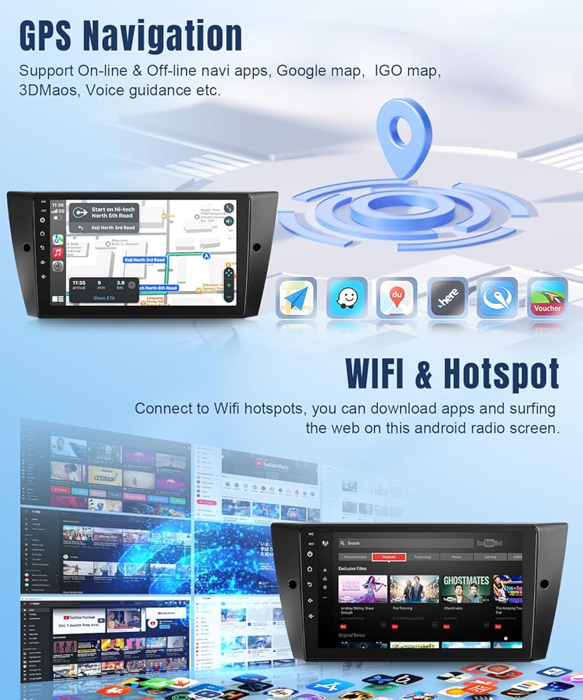 【ملاحة GPS/GPS عبر الإنترنت و WIFI】 التنقل المدمج في GPS ، هذا الاستريو لعام 2007 BMW 328I متصل عبر WiFi أو النقطة الساخنة لهاتفك ، ثم يمكنك تنزيل الخرائط دون اتصال بالإنترنت أو استخدام الخرائط عبر الإنترنت في أي وقت (عبر القائمة - تنزيل خريطة). يمكنك استخدام Apps Store تمامًا ، حيث يتيح لك CarPlay BMW 328I 2008 استخدام أي تطبيق مثل الخرائط عبر الإنترنت ، Tiktok ، Facebook وما إلى ذلك ، يمكنك استخدام 2010 BMW 328I مثل iPad.