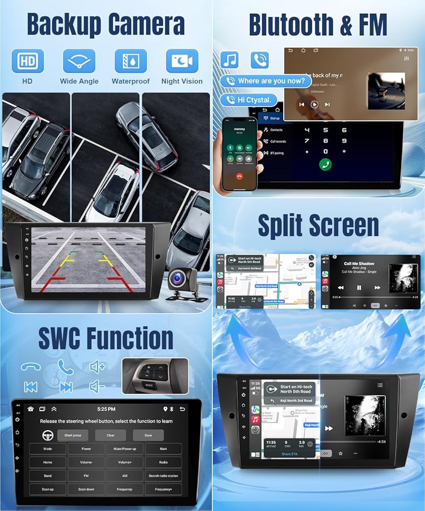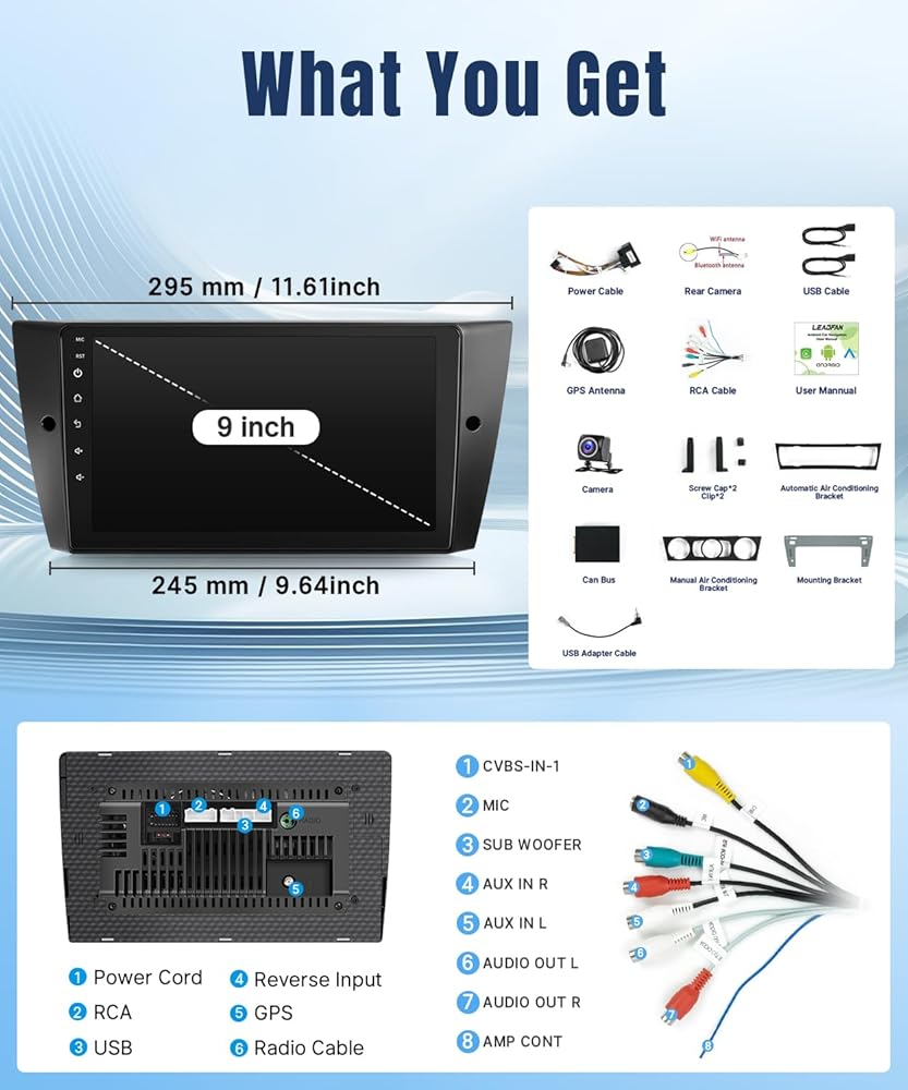 【MirrorLink/SWC/AHD Camera 】①2011 BMW 328I Carplay Stereo مع MirrorLink ، مما يتيح الوصول إلى تطبيقات هاتفك , الموسيقى ، ومقاطع الفيديو ، والمزيد من خلال BMW 335I Radio.②support SWC ، والاستمتاع بالتحكم اليذر في المكالمات ، والتعديلات على مستوى الصوت ، وتغيير المسار الموسيقي. for 2006 BMW 325I Radio مع صورة عكسية AHD ، وعدسة زاوية عريضة 170 درجة ، و IP68 مقاومة للماء ، ووظائف الرؤية الليلية ، وأكثر أمانًا! إذا كان لديك أي أسئلة ، يرجى النقر فوق "تم بيعها بواسطة Leedfan و" اطرح سؤالاً " للدعم الفني.