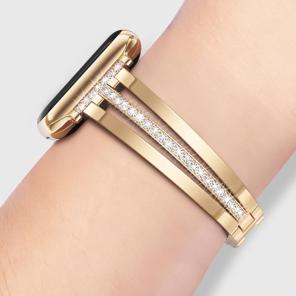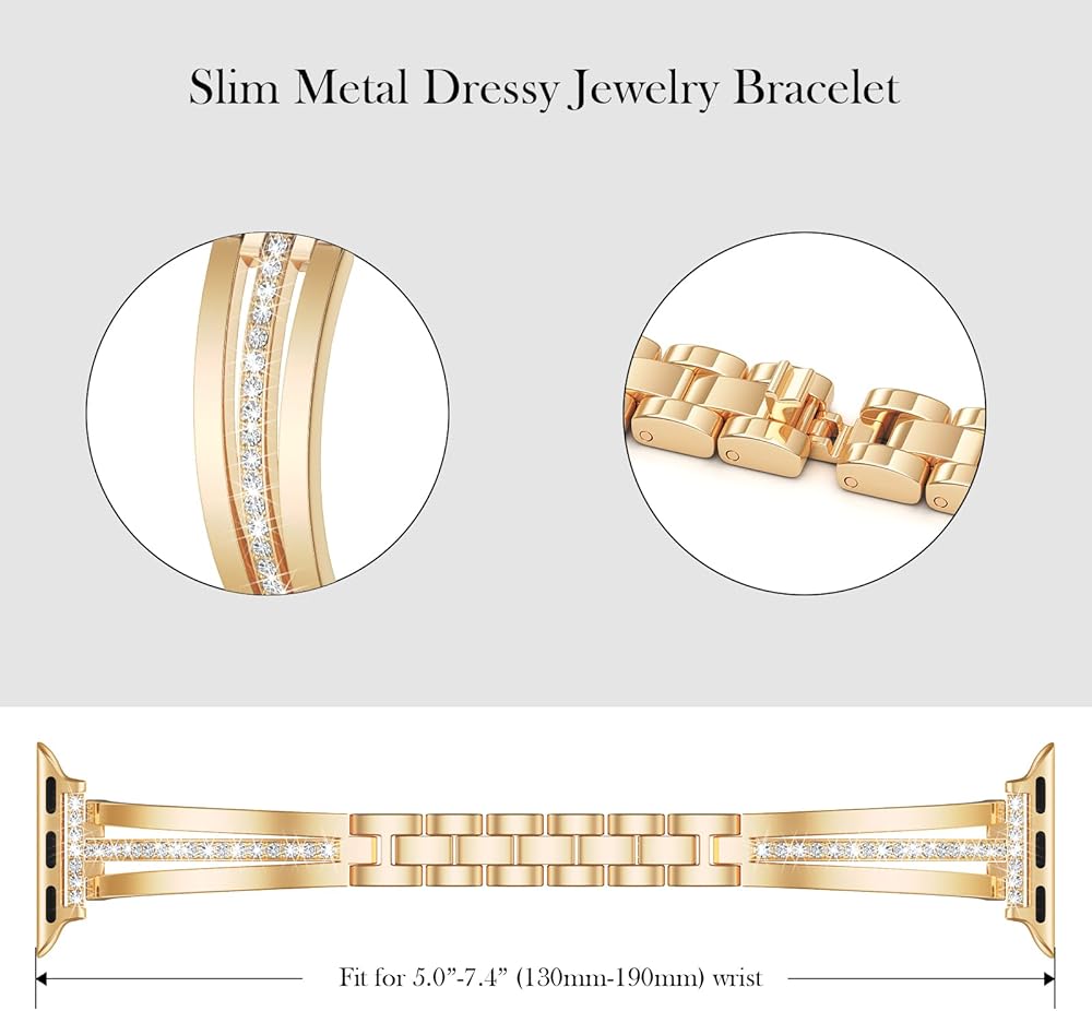 نطاقات Watch Slim Apple للنساء: يتكون حزام Apple Watch الأنيق من الفولاذ المقاوم للصدأ مع بنية ذهبية. تضيف نطاقات Apple Watch الرقيقة للنساء نداءًا أنثويًا إلى معصمك. إن الماس الشراركي المبطن في الوسط ممثل يدويًا ومدمجًا بحزم لضمان تضييق كل التألق إلى الأبد.