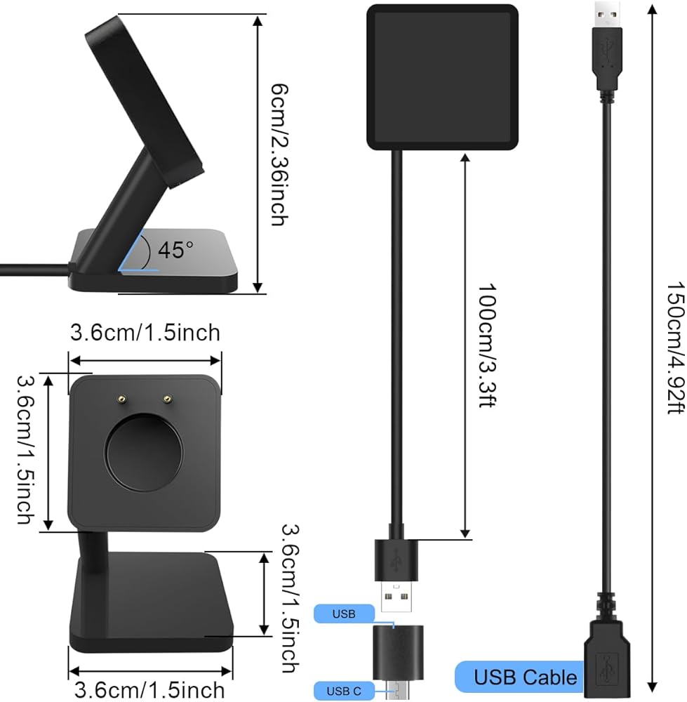 Package Content: 1 pcs watch charger dock; 1 pcs USB extension cord (If the watch charger cable is not long enough for you, you can use a USB extension cable to extend it); 1 pcs USB female to USB C male adapter(The adapter can convert a USB A charger to a USB C charger).