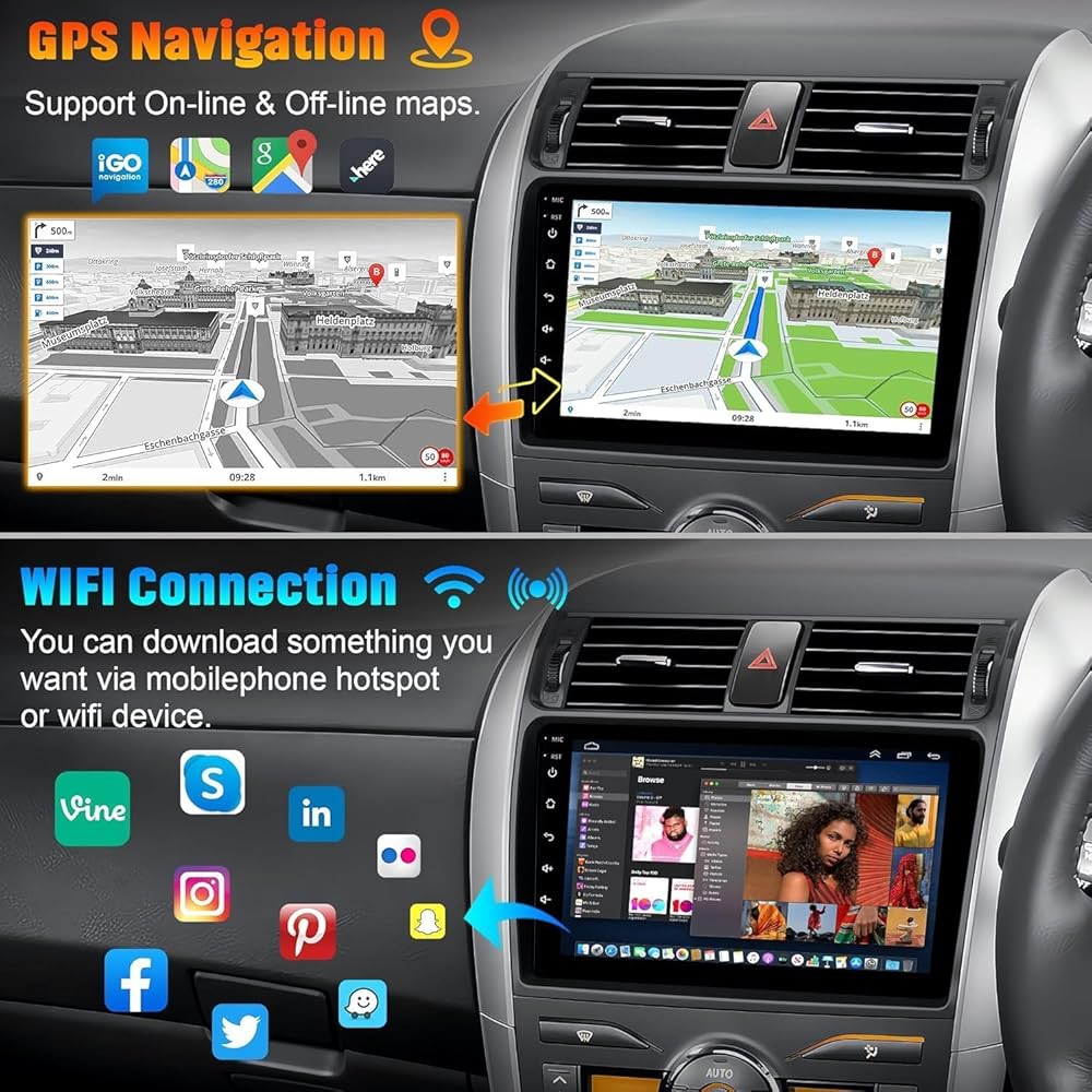 【GPS Navigation & WiFi Connectivity】 Stereo Car Toyota Corolla 2009-2013 يتميز بنظام ملاحة مزدوج يدعم الخرائط غير المتصلة بالإنترنت وعبر الإنترنت. هذا يتيح القيادة الآمنة حتى في المناطق التي لديها استقبال ضعيف أو معدوم. بالإضافة إلى ذلك ، من خلال الاتصال بـ WiFi ، يمكنك الوصول إلى وظائف الهاتف المختلفة مباشرة على استريو سيارة Android ، مما يعزز الراحة والاتصال.