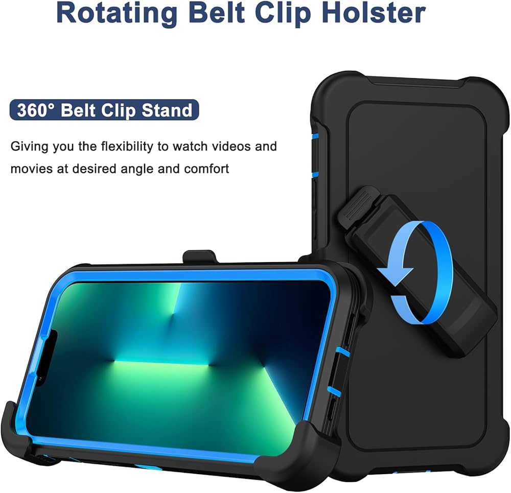 Rubcase for iPhone 13 Pro Max Case مع واقي شاشة 2x ، وغطاء مزدوج الطبقة المصد مع حزام حزام حافظة و Kickstand ، وكامل الجسم هواتف وعرة من أجهزة iPhone 13 Pro Max (أسود/أزرق)