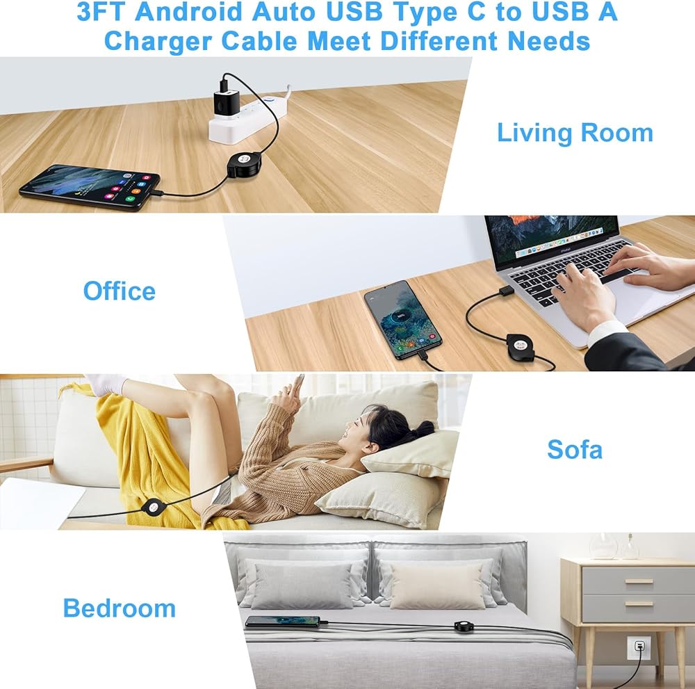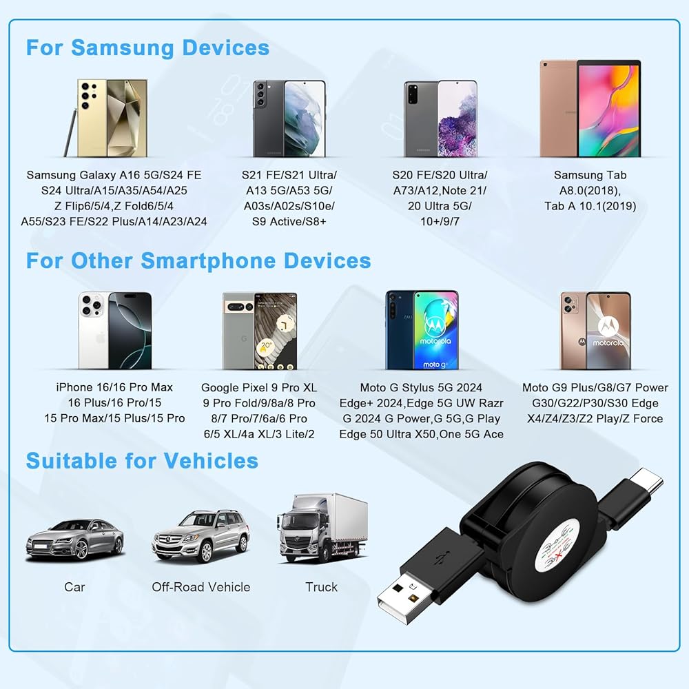 • 【USB to USB C Android Auto Phone Charger Cord】Retractable Car Charger Cord Type C Android Phone Charger Cable supports safe high-speed charging at 3A and data transfer speed up to 480Mb/s, 30% faster than other cable. Data Transfer and Power Charging 2 in 1. 56kΩ resistor provide outstandingly reliable conductivity & stability, protect your samsung galaxy s25 a16 5g a35 a25 s24 fe s24 ultra s23 plus a15 a54, iphone 16 plus 16 pro max 15 pro max 15 plus phone and charging adapter from damage.