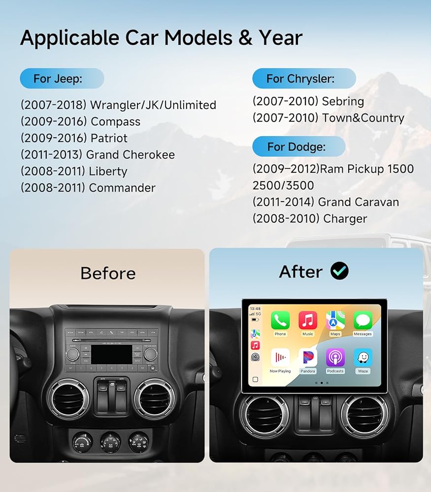 【نماذج السيارات المعمول بها】 Jeep Wrangler/Unlimited 2007-2018 ؛ لجيب Compass 2009-2016 ؛ لجيب باتريوت 2009-2016 ؛ لجيب جراند شيروكي 2005-2011 ؛ لجيب ليبرتي 2008-2011 ؛ لجيب قائد 2008-2011 ؛ لكرايسلر سيبرينغ 2007-2010 ؛ لـ Town & Country 2007-2010 ؛ ل Dodge Grand Caravan 2011-2014 ؛ بالنسبة إلى Dodge Charger 2008-2010 ؛ ل Dodge Ram Pickup 1500/2500/3500 2009-2012. تحتوي الحزمة على أي ملحقات سيارة تحتاجها عند تثبيت الراديو.