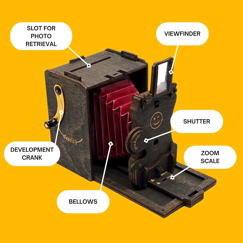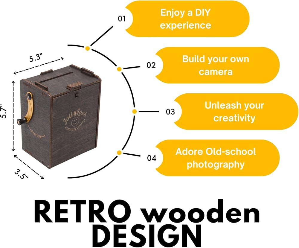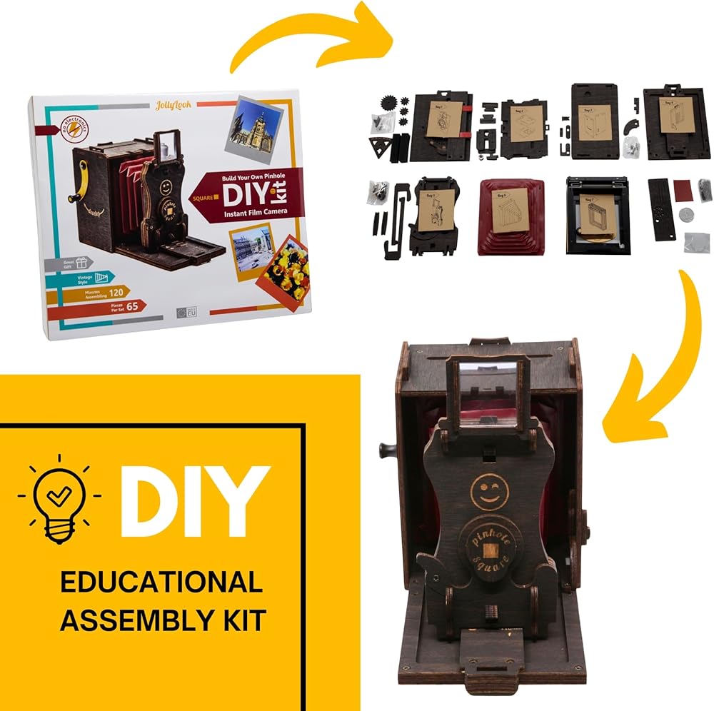 Experience the magic of analog photography with the Jollylook DIY Pinhole SQUARE Instant Film Camera Kit! This beautifully crafted self-assembly wooden camera lets you build and use a fully functional pinhole camera that captures stunning vintage-style images. Compatible with Instax SQUARE film (Not included). Designed for DIY enthusiasts, photographers, and STEAM learners, this kit provides a hands-on way to explore the fascinating principles of pinhole photography while creating a one-of-a-kind functional camera. 🌱 Eco-Friendly & Sustainable Unlike plastic instant cameras, Jollylook is made from natural wood, making it a plastic-free, biodegradable, and environmentally conscious alternative. 🔬 Educational & Engaging Perfect for kids, teens, and adults, this camera kit combines science, technology, engineering, arts, and math (STEAM) learning into an interactive and creative experience. Learn about light exposure, focal lengths, and how classic pinhole cameras work! 📷 Fully Functional DIY Instant Camera Once assembled, your Jollylook camera features a manual shutter, film ejection system, and adjustable exposure, allowing you to experiment with pinhole photography in a way that's both artistic and nostalgic. 🎁 A Perfect Gift for Photography & DIY Lovers Surprise your loved ones with a unique and thoughtful gift that brings together creativity, craftsmanship, and the joy of instant photography. Ideal for birthdays, holidays, and photography workshops! 📦 What's in the Box? Pre-cut wooden parts for camera assembly Easy step-by-step instruction manual Film ejection mechanism Lens cap and shutter system Film – compatible with Instax SQUARE film (NOT included) 🔹 Build, Shoot, and Enjoy! Get your Jollylook DIY Pinhole SQUARE Instant Film Camera Kit today and start capturing the world in a whole new way!