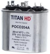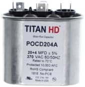 Packard has received the call to create a USA-made capacitor to provide contractors with confidence on the job. Our answer is Titan HD™. With a substantial 60,000 hours of operating life, it is just as hardworking as those who made them. Made in USA, Full product offering €“ 234 ratings available!, 60,000 hours operating life, Meets the rigorous EIA-456-A industry standard for performance and quality. Eye-catching packaging for retail environment, Contains metalized polypropylene film technology for self-restoration in the event of a breakdown. Sophisticated UL-approved pressure sensitive interrupter to remove the capacitor from circuit at end of life, Patented, environmentally-friendly oil prevents corrosion and aids in optimum heat transfer. Capacitor Voltage: 370, Run MFD: 20+4, Capacitor Shape: Oval, Brand: Titan HD, Can /Case Size: 12, Country of Origin: USA, Hertz: 50/60, Material: Aluminum Can, Oil Type: Soybean Based, Operating Temperature Range: -40 to 70, Terminals: Standard blade terminals, Tolerance: +/- 5%, UPC: 840899105086, Voltage: 370
