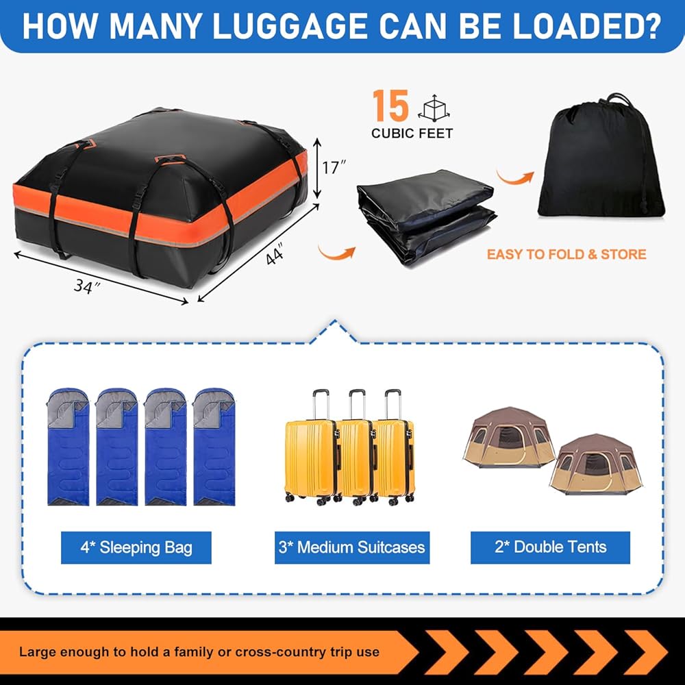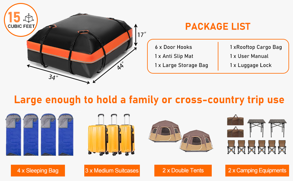 15 قدم مكعب سعة كبيرة: 15 قدم مكعب (44 "L x 34" W × 17 "H) من المساحة يمكن أن تحمل 4-6 حقائب ، علبة أمتعة السفر ، والخيام ، وأكياس النوم ، والمزيد. توفير المزيد داخل مساحة السيارة لمزيد رحلة برية مريحة