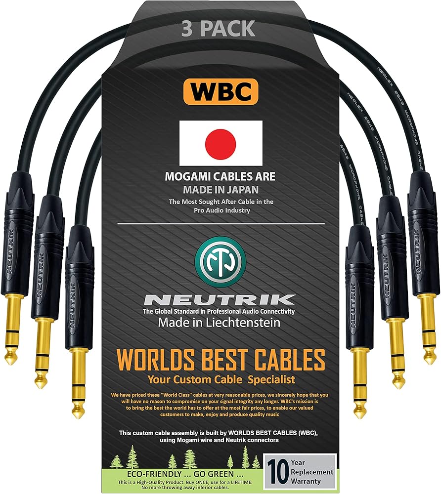 • This is a custom built cable assembly, by WORLDS BEST CABLES (WBC). This cable assembly is made using the Mogami 2549 (Black) wire and Neutrik NP3X-B Male TRS Stereo Connectors. We at WBC always make world-class custom-built cable assemblies using many of the leading cable and connector brands, if you are unable to find the length and type of cable you are looking for, please feel free to contact us, we will strive to assemble the required cable for you.