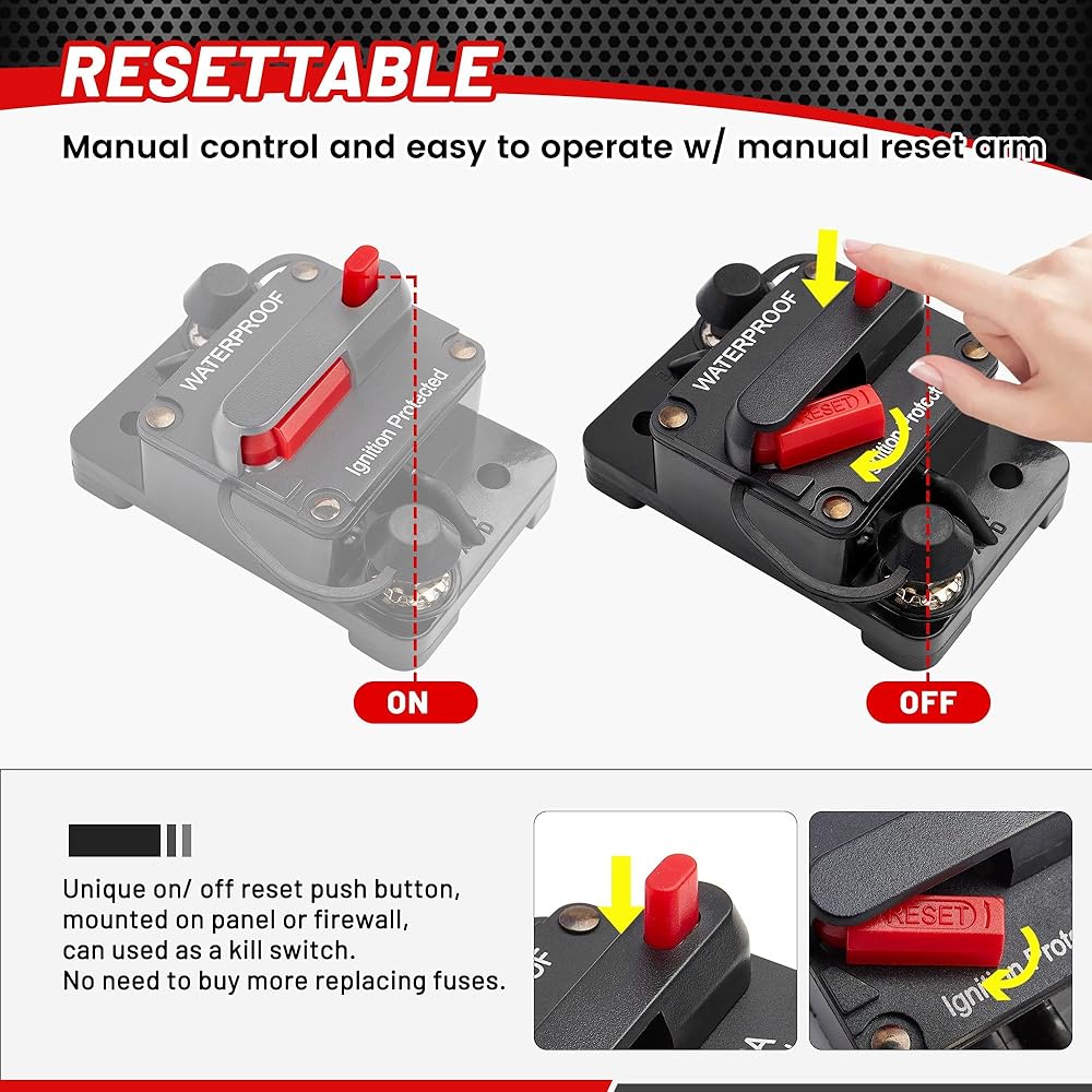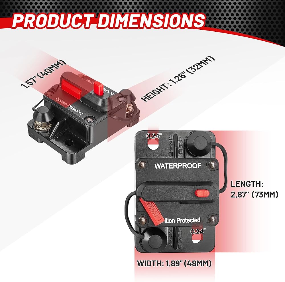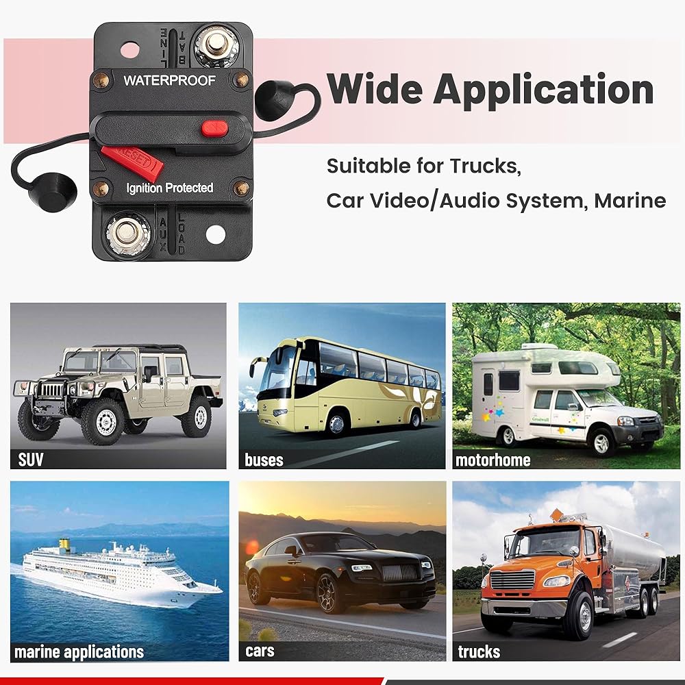 FUSE Circuit Breaker Fuse Protect Auto System: تم تصميمه لحماية قوارب RV Yacht Trailer Truck Truck ATV Winches System من التيار الزائد نتيجة لسحب الطاقة العالي أو الدوائر القصيرة أو أخطاء الأسلاك أو أخطاء المعدات أو أي حدث آخر عالي. ؛ مع غطاء محول الحماية ، فإن مسمار المعزولة ، والبلاغ والغبار دليل ؛ يمكن أيضًا استخدامه في شحنات البطارية ونظام مضخم صوت DC