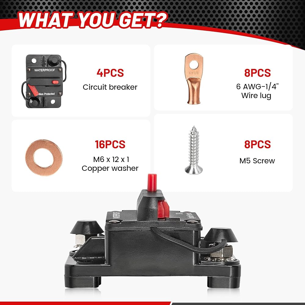 شملت الحزمة: 4 × قاطع دائرة 30A مقاوم للماء ، و 8 × العروات الأسلاك ، وغسالات 16 × ، و 8 × براغي وتعليمات التثبيت