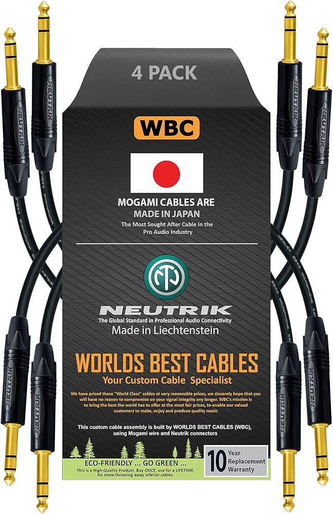 This is a custom-built cable assembly, made by WORLDS BEST CABLES (WBC). This cable assembly is made using the Mogami 2549 (Black) wire and Neutrik NP3X-B Gold Male ¼ Inch TRS Stereo Connectors. We at WBC always make world-class custom-built cable assemblies using many of the leading cable and connector brands, if you are unable to find the length and type of cable you are looking for, please feel free to contact us, we will strive to assemble the required cable for you.