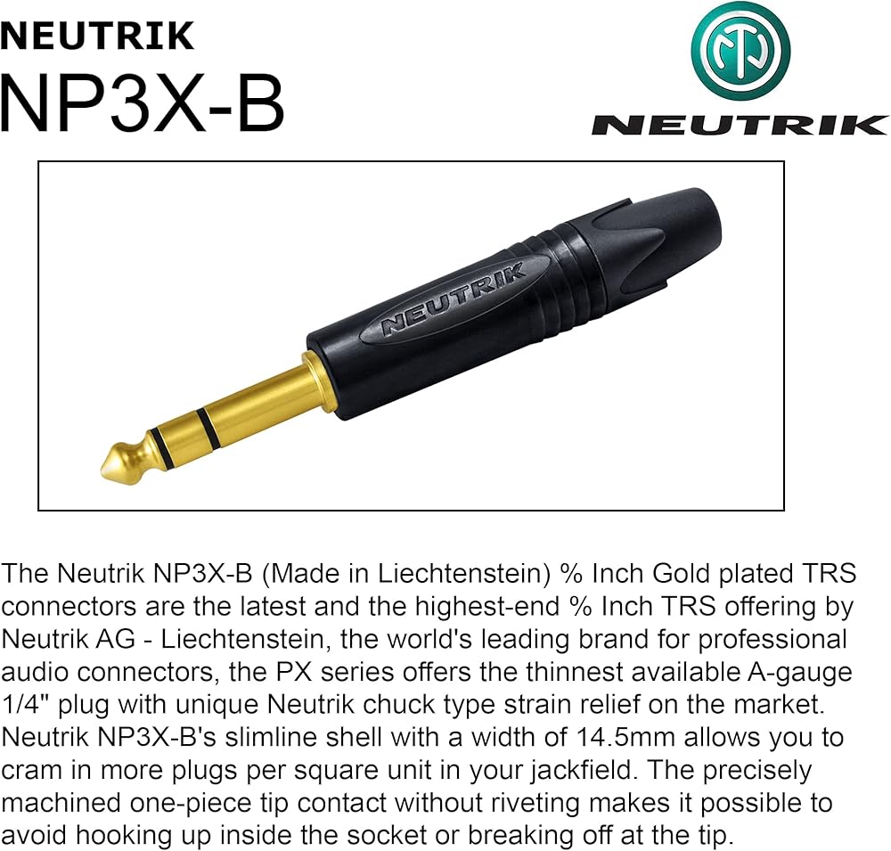 The brand of connector we used for this custom cable assembly: Neutrik NP3X-B is the latest & the highest-end ¼ inch Gold-plated Straight TRS offering by Neutrik AG- Liechtenstein, the world's leading brand for professional audio connectors. Sports a slimmer shell & a precisely machined one-piece tip.