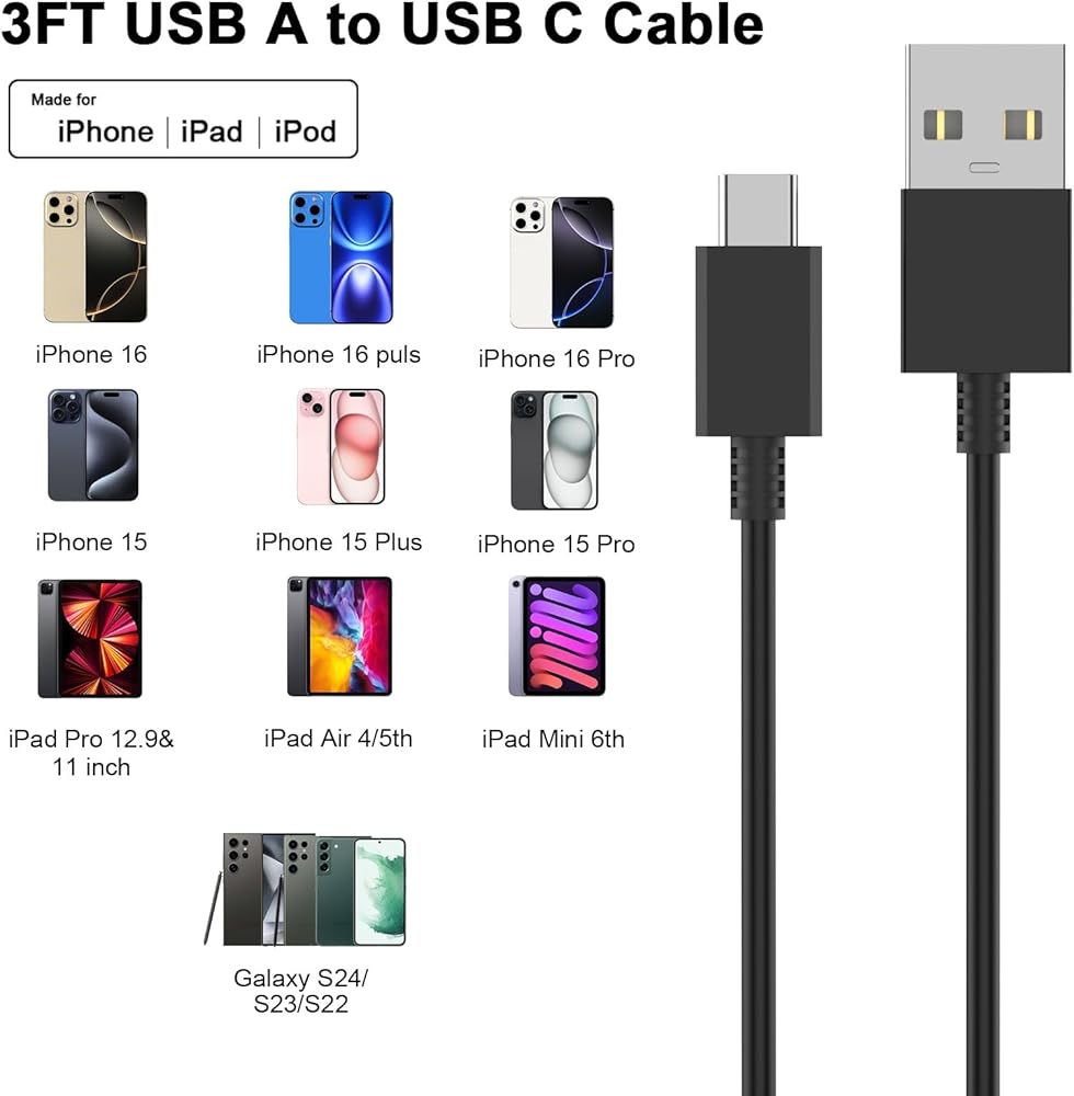 The USB to Type-C 60W data cable can not only quickly charge Type-C phones, for iPhone 16/16 Pro/16 Pro Max/16 Plus, iPhone 15/15 Pro/15 Pro Max/15 Plus, iPad,for Galaxy S24/S23+/S23 Ultra/S22/S22+/S22 Ultra/S21/S20/Note 20, for Pixel, and more phones , but also support fast charging of Type-C laptops and tablets.