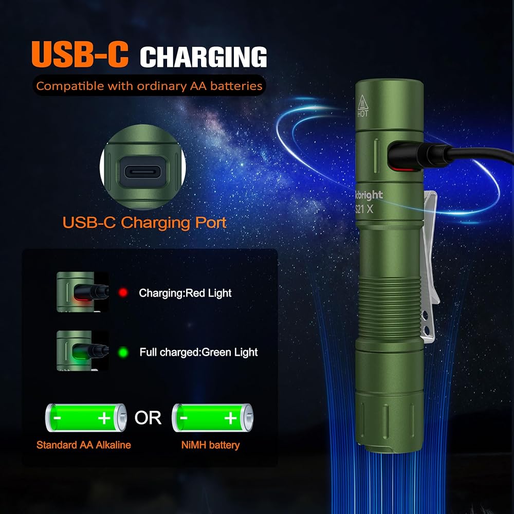 • شحن Type-C: تم تجهيز مصباح يدوي AA هذا ببطارية قابلة لإعادة الشحن 1000mAh ، متوافقة مع بطاريات AA العادية ، مشحونة بالكامل خلال 1.5 ساعة مع مؤشر الشحن ، وتشغيل الوضع المنخفض حتى 97 ساعة