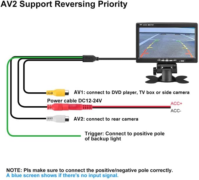 [أي مشكلة PLS اتصل بخدمة العملاء لدينا]-[7 بوصة شاشة TFT LCD Digital]: متوافق مع نظام PAL/NTSC ، بسهولة التركيز على اللوحة. وضعان فيديو (V1 لمشغل DVD أو مربع التلفزيون أو الكاميرا الجانبية / V2 للكاميرا الاحتياطية) ، تعرض V2 (موصل أبيض) في الأولوية ، قم بالتبديل تلقائيًا إلى V2 بمجرد الحصول على إشارة عرض الفيديو الخلفية