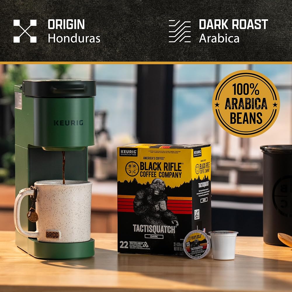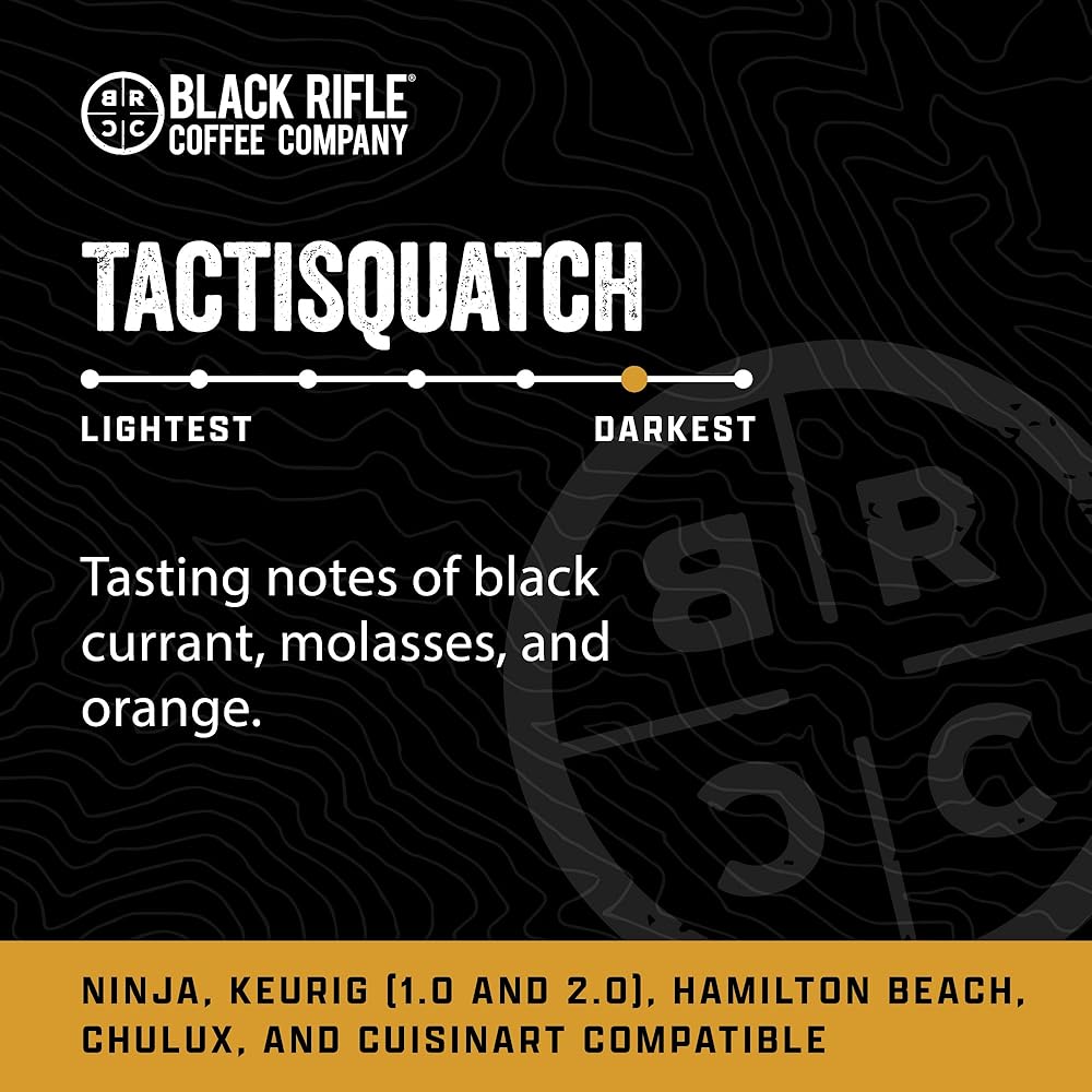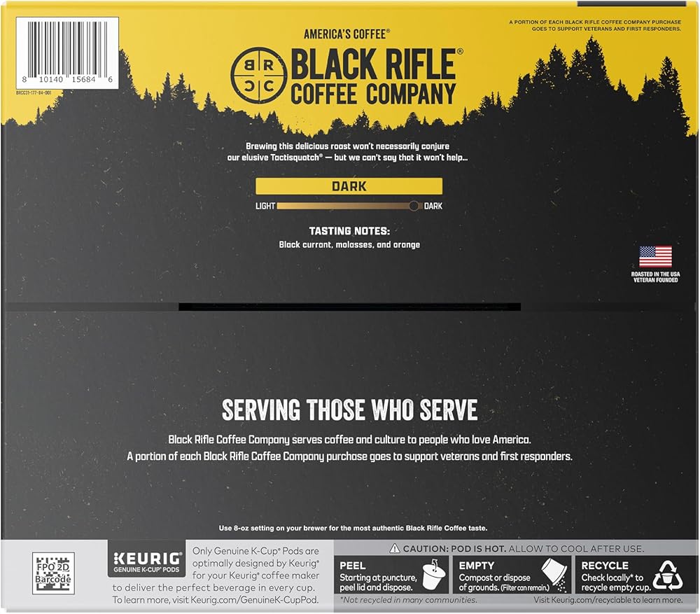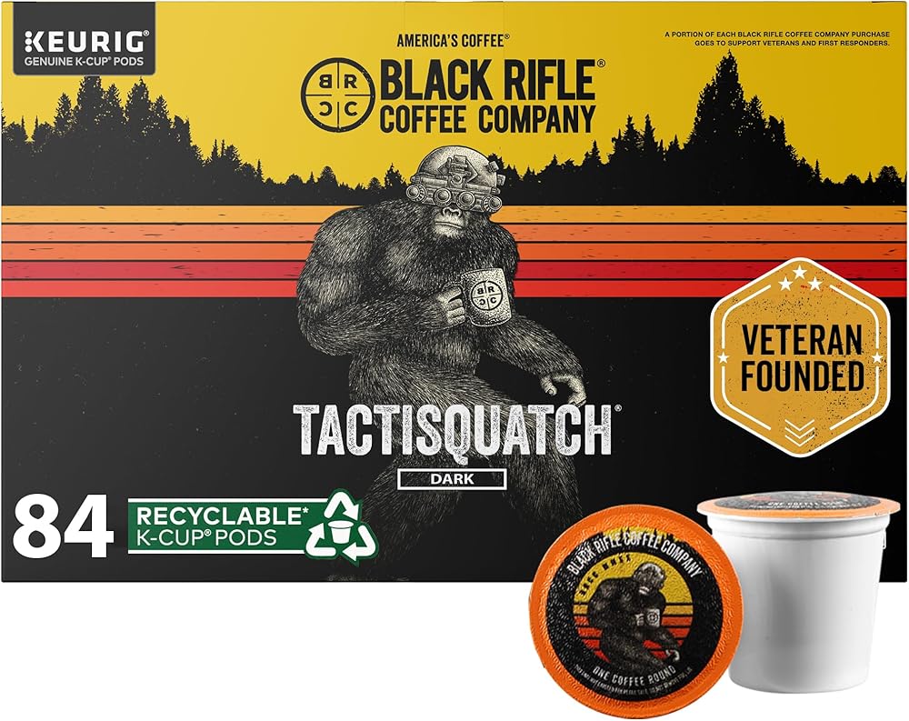 Includes: 84 K Cup coffee pods of Black Rifle Coffee Company Tactisquatch dark roast coffee