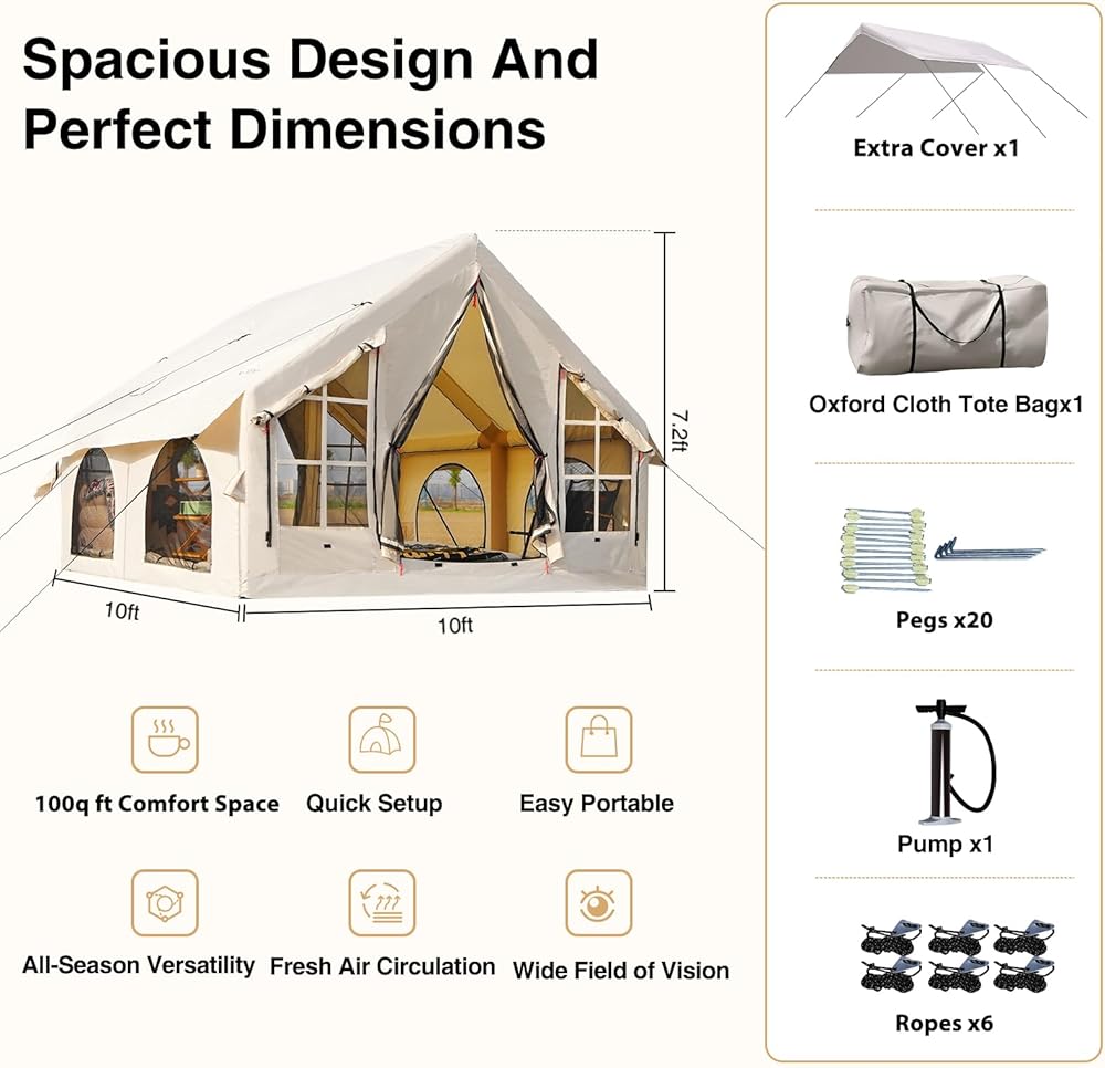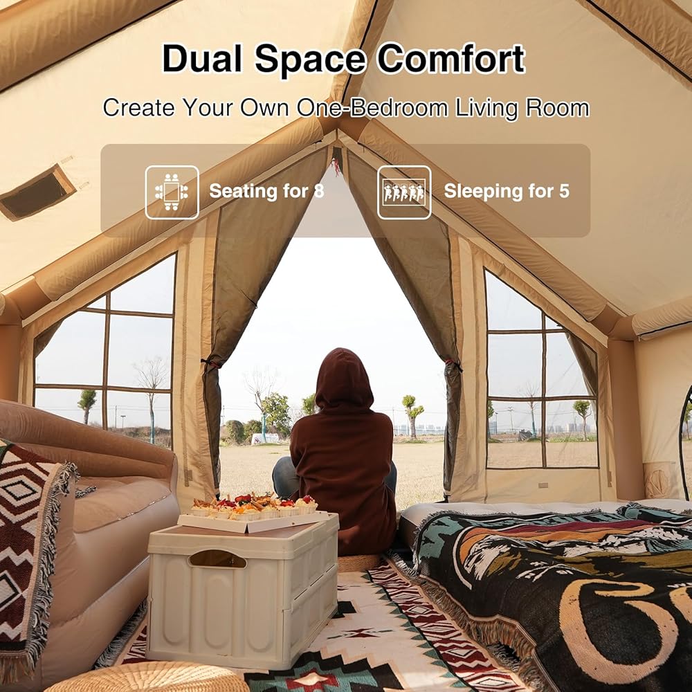 PVC المغلفة السفلية والنوافذ ذات الطبقة المزدوجة: يضيف القاع المطلي PVC القوة والمتانة ، مما يوفر حماية إضافية ضد التآكل والدموع للاستخدام طويل الأمد. تسمح نوافذ الطبقة المزدوجة ذات السوستة المزدوجة بالهواء النقي مع الحفاظ على المساحات الشخصية وداعًا لمشاحنات إعداد الخيمة التقليدية! يمكن تضخيم خيمتنا القابلة للنفخ دون عناء في دقائق فقط باستخدام مضخة الهواء المضمونة ، ولا تقلق بشأن الأجزاء المفقودة أو التالفة