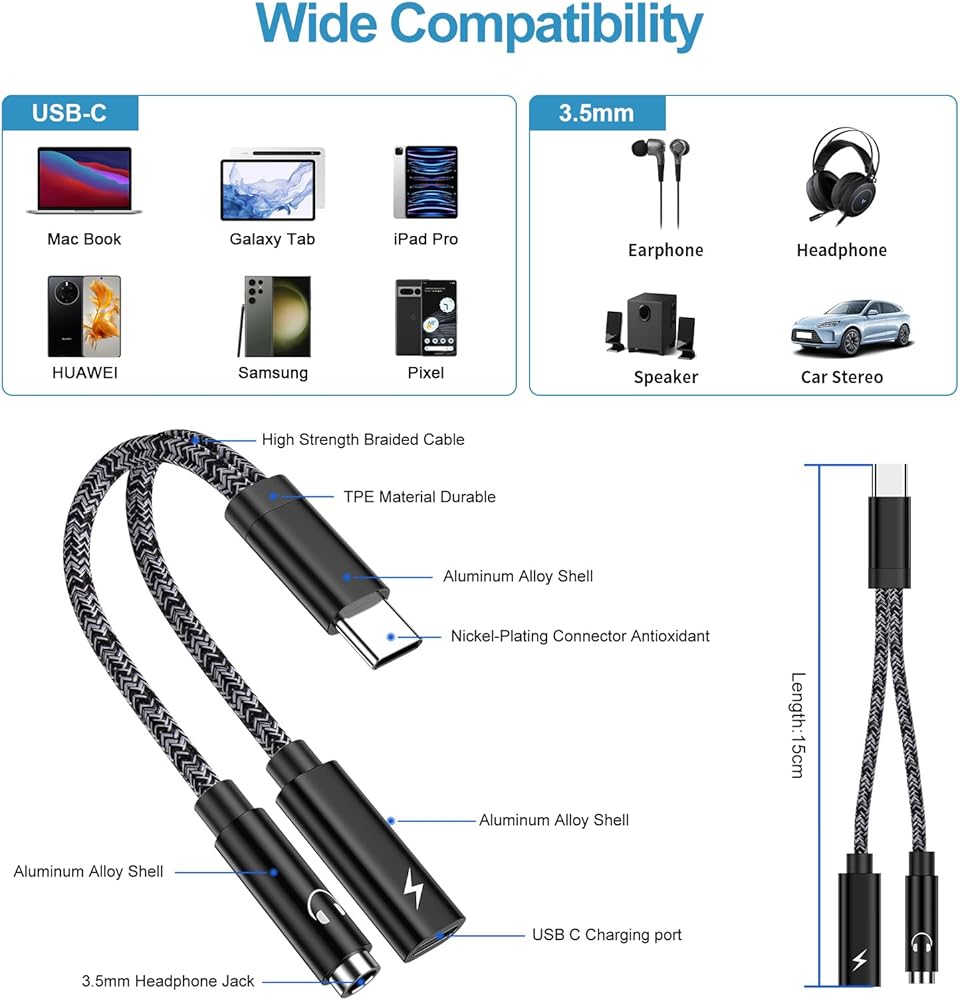 5.9 inch 15cm type c to 3.5mm samsung headphone adapter is 15g, convenient for you to outdoor running and traveling.
