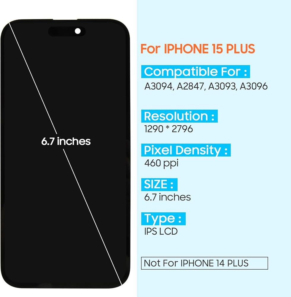 for iPhone 15 Plus LCD Screen Replacement: Our LCD screen replacement(without frame) for iPhone 15 Plus is only compatible with iPhone 15 Plus A3094,A2847,A3093,A3096 6.7 inch models. Please ensure that your cellphone model number matches before placing an order