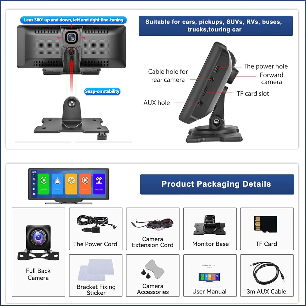 • 9.3 بوصة شاشة CarPlay Carplay كاملة أو شاشة تقسيم: استخدمها كنظام كاميرا احتياطية للسيارة أو الشاحنة ، لديه قدرة على الشاشة مع إدخال فيديو ثنائي الاتجاه ، يمكنك مشاهدة صورة واحدة أو تقسيم الشاشة للعرض المزدوج. بالنسبة إلى Apple Carplay ، يمكنك تعيين شاشة مقسمة أو شاشة ملء. تدعم وظيفة Android Auto شاشة الانقسام فقط. كاميرا خلفية صغيرة الحجم مع كابل 10 أمتار ، يمكنك إخفاءها حول لوحة الترخيص. تتيح لك العدسة عالية الدقة ذات الألوان الكاملة رؤية الألوان الحقيقية في الليل والحصول على صورة أوضح