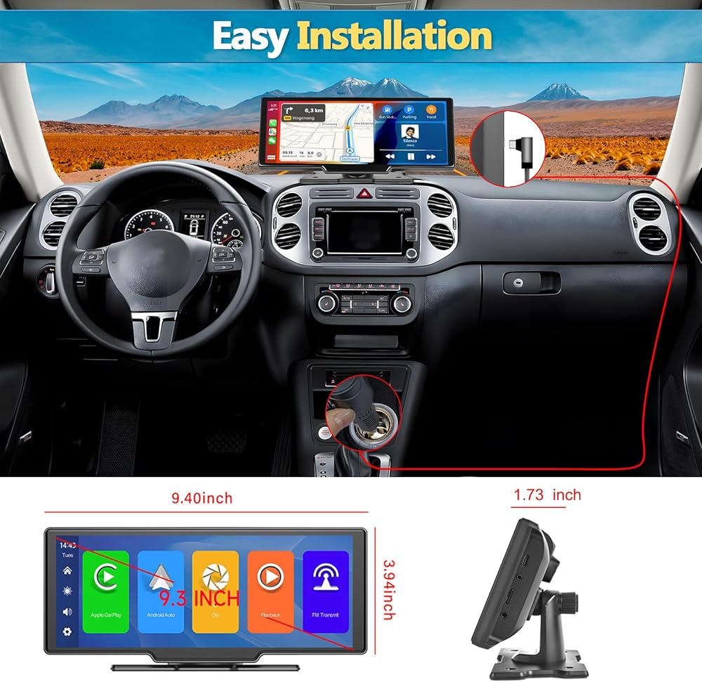 Unitopsci Portable Wireless Apple Carplay Car Stereo مع 2.5K Dash Cam & HD Camera 9.3 بوصة IPS الشاشة التي تعمل باللمس Android Auto Car شاشة للسيارة ، Bluetooth ، GPS الملاحة ، بطاقة 64G TF ، DVR