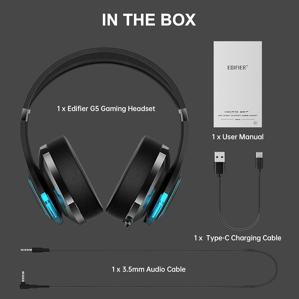 سماعات ألعاب اللاسلكي G5BT Edifier ، فوق سماعات بلوتوث الأذن مع ميكروفون مزدوج قابل للسحب للكمبيوتر الشخصي/PS4/الهاتف المحمول ، مقبس الصوت 3.5 ملم ، RGB Light - Black