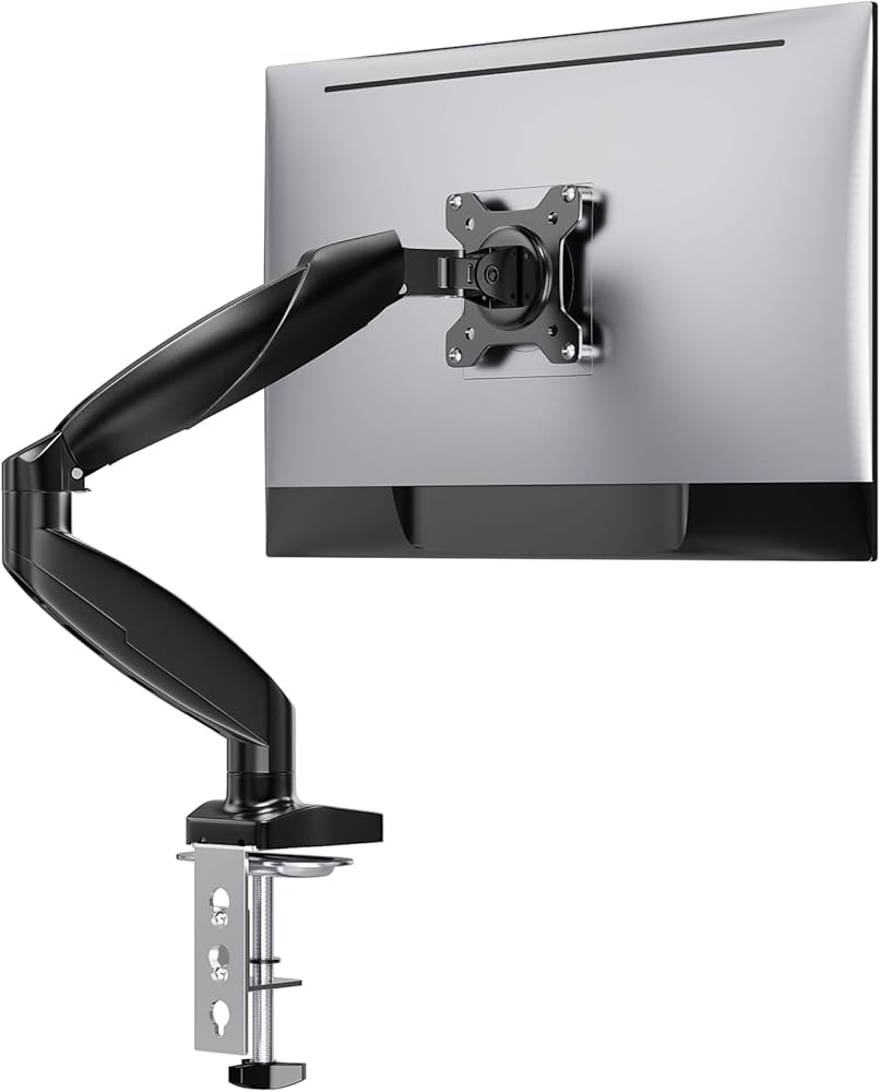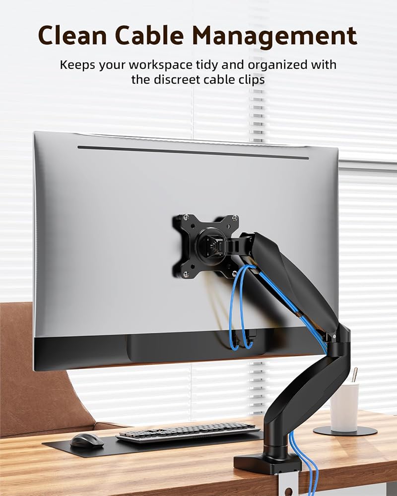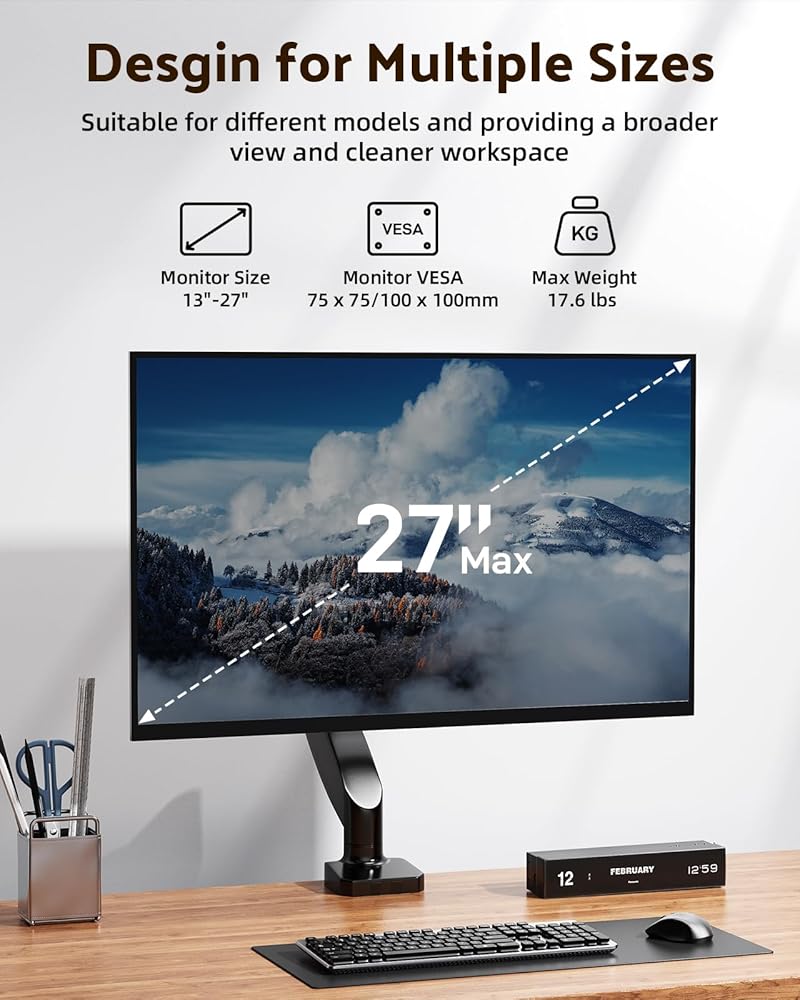 Compatible with Multiple Screen Sizes: Suitable for 13"-27" flat or curved screens, this single monitor mount supports VESA 75x75mm and 100x100mm patterns, making it versatile for different models and providing a broader view and cleaner workspace