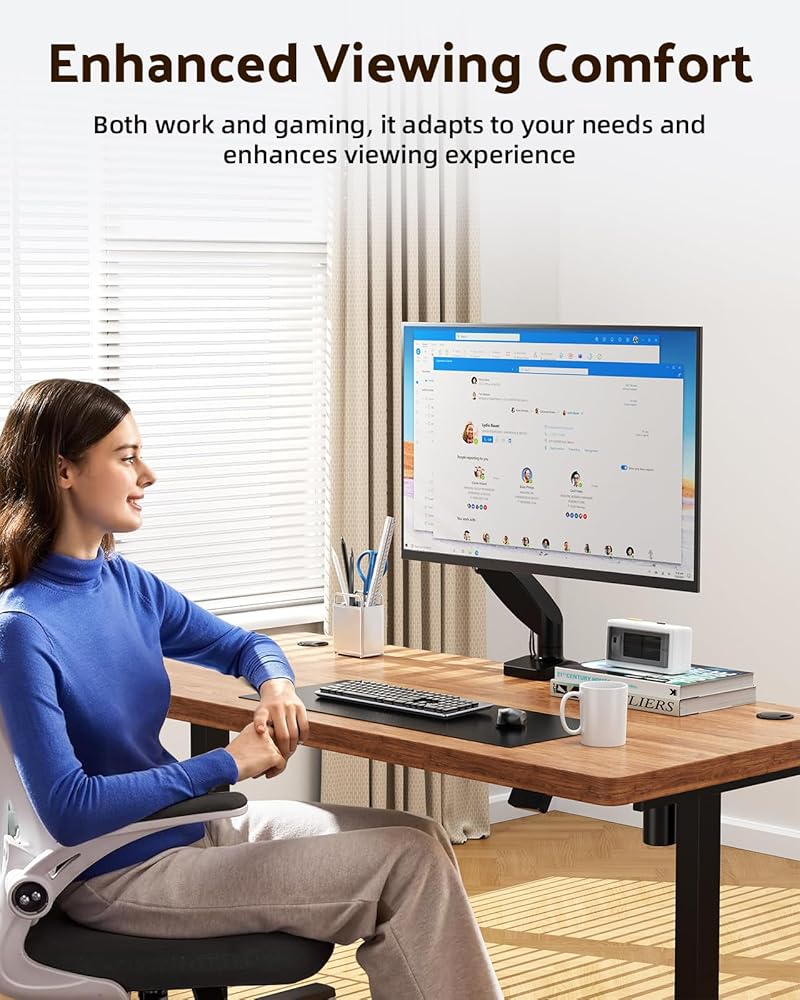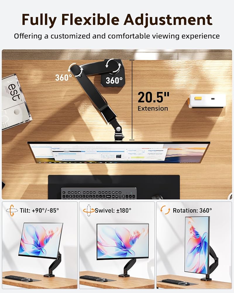 Enhanced Viewing Comfort: Effortlessly adjust monitor to eye level; reducing neck and back strain. The gas spring tension lets the arm extend 20.5 inches outward and rise 15.6 inches above the desktop, offering a customized and comfortable viewing experience
