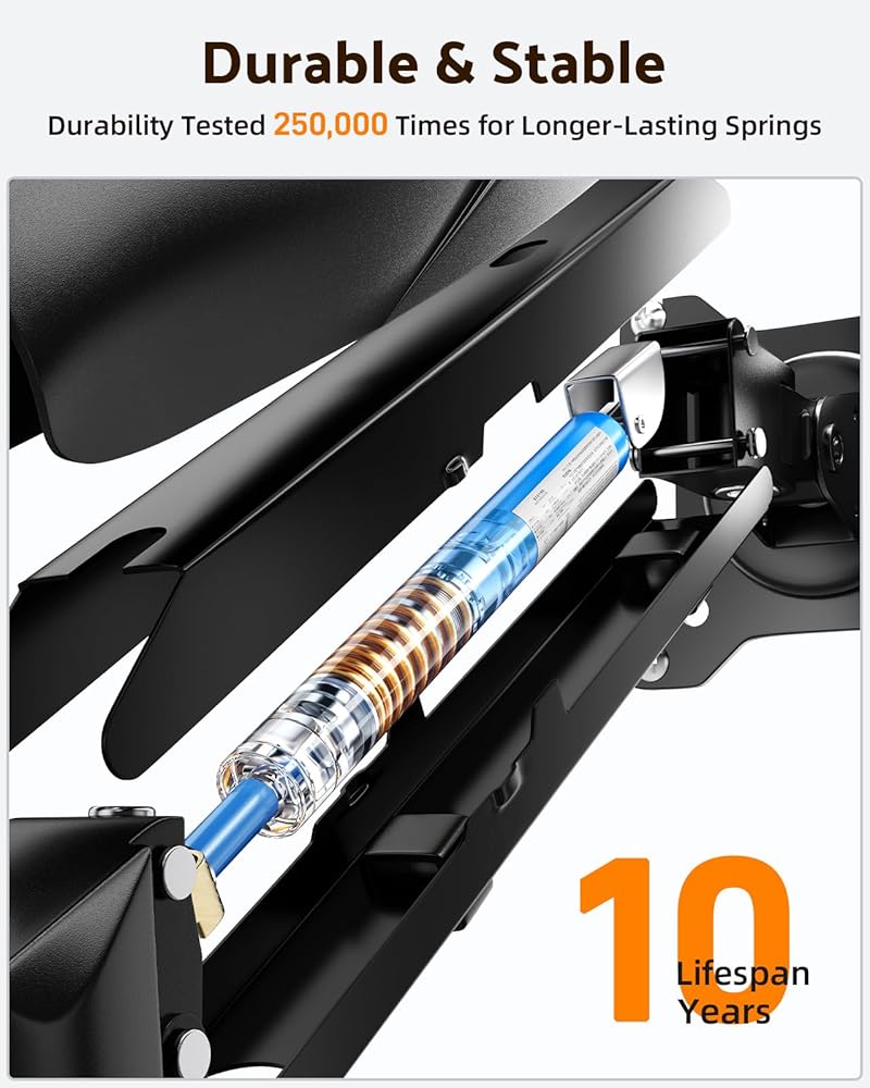 Stable and Durable Construction: Equipped with advanced gas spring technology, the dual monitor arm adjusts spring tension based on monitor weight and is factory-tested for up to 25,000 adjustments, ensuring smooth and reliable positioning