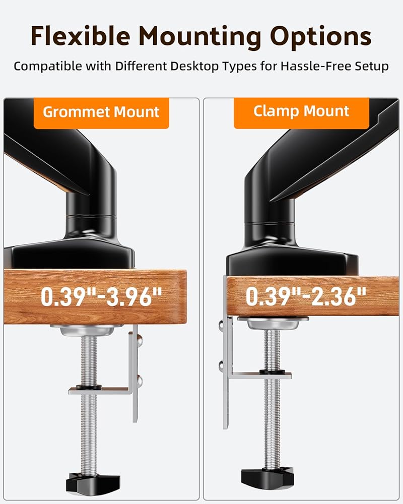 Flexible Mounting Options: Use the "C" shaped clamp mounting for desks between 2.36 and 3.96 inches thick; or select the grommet base mounting for desks between 1.57 and 2.36 inches thick. For glass surfaces, an additional metal reinforcement plate may be required