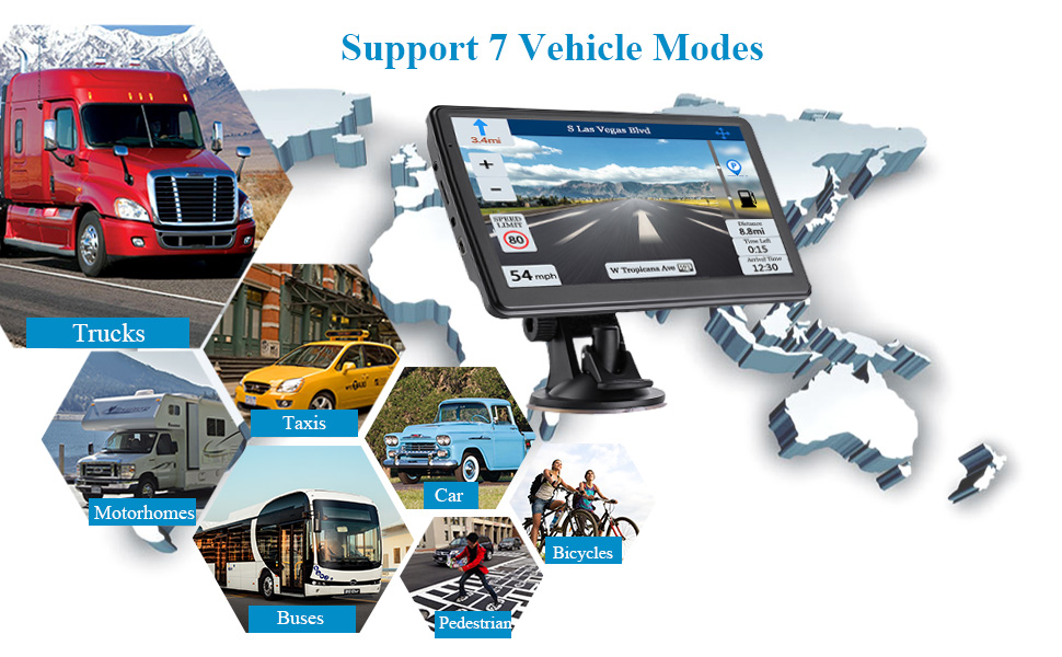 🚗【 يدعم 7 أوضاع مركبة】 تنقل GPS مناسب للسيارات والحافلة وسيارات الأجرة والدراجات والطوارئ والمشاة. عند قيادة السيارة ، ستستفيد من معلومات الطول والعرض والطول والوزن والبيانات الأخرى. مع كوب شفط ومقطع خلفي ، يمكنك بسهولة إصلاح GPS للشاحنة إلى الزجاج الأمامي أو لوحة القيادة. يجعل القيادة أكثر راحة. نظام الملاحة في 44 لغة ،