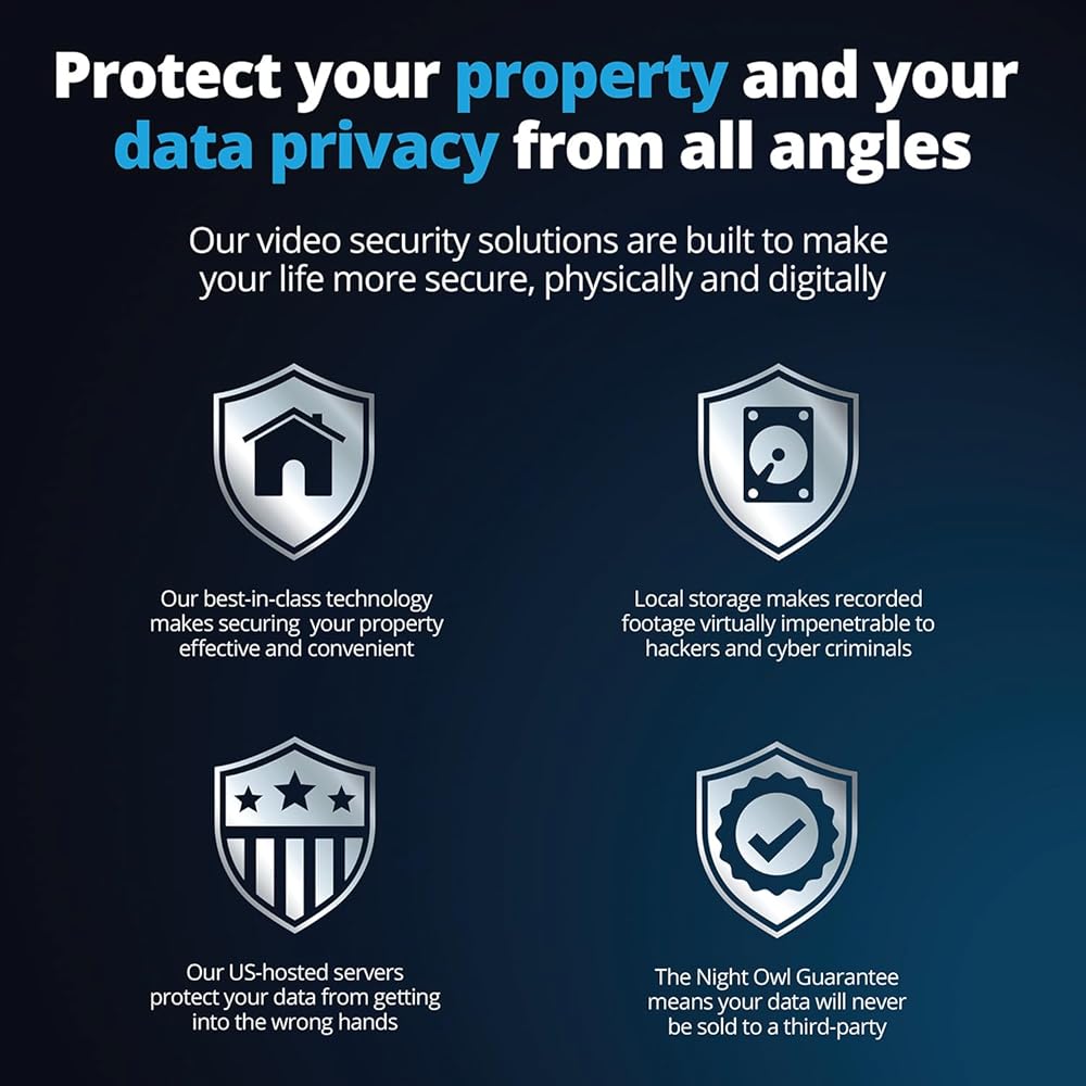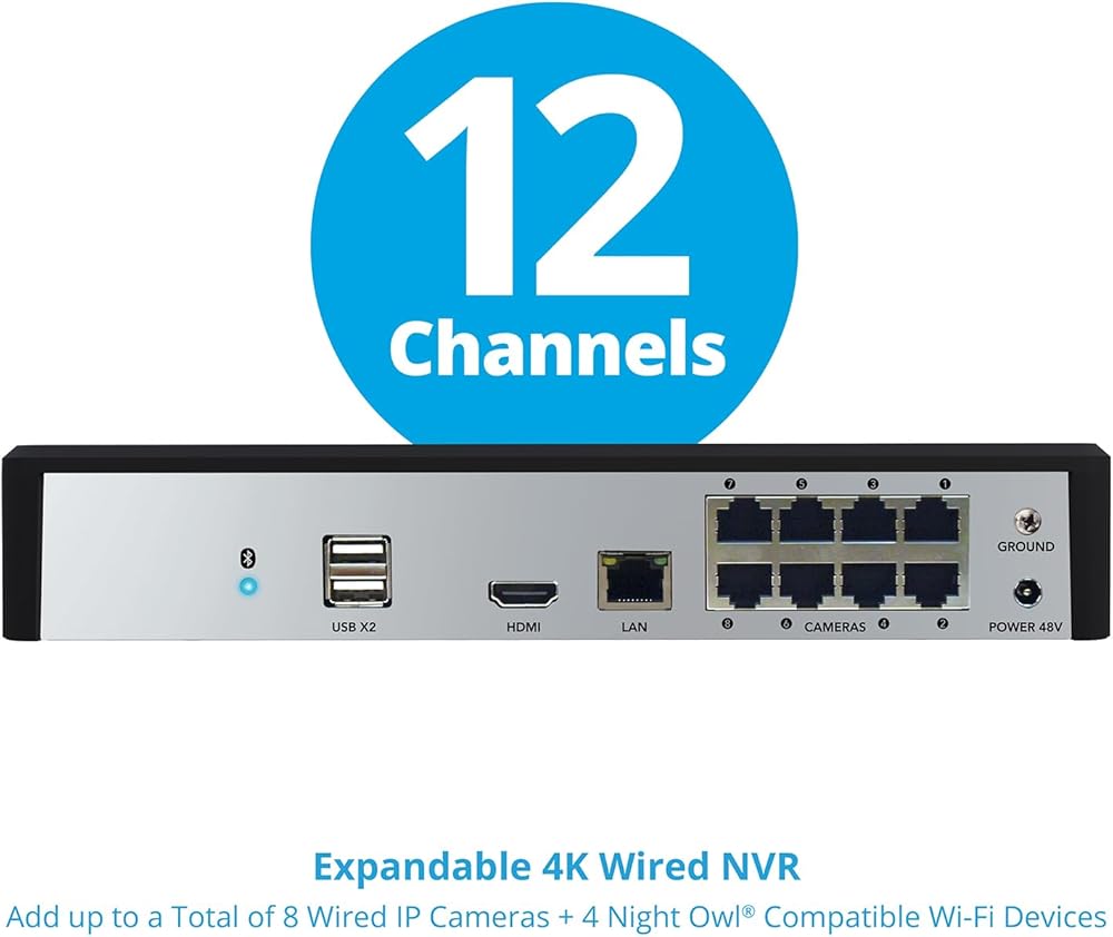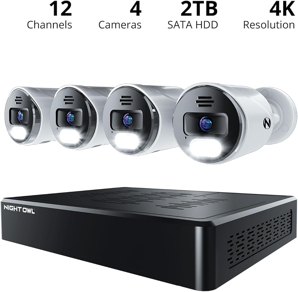 "When life gets hard, make your security easy. Introducing our 4K 2-Way Audio NVR Security System. Every Night Owl product is meticulously designed and engineered in the United States and fully NDAA and FCC compliant. With secure app-based Bluetooth setup, there is no need to connect a TV or monitor for setup or viewing (optional). Easily set up the system right from the convenience of your mobile device. Your 4K wired IP cameras have full-color day viewing and full-color night vision up to 100 ft., which provides colorful recordings that capture every detail. With a bright built-in spotlight, you can light up the dark and ward off unwanted guests. For situations where seeing is not enough, easily make your voice heard. With 2-way audio you can listen and talk with anyone who approaches, making your presence known. Still not enough? Use our preset voice alerts and booming camera siren to shout a warning when a suspicious stranger nears. You will receive key alerts to your mobile device for important matters, such as people and vehicles as they arrive and depart. All recordings and personal data are privately stored on the recorder's hard drive for secure access with zero costs. Your privacy matters and your recordings and for your eyes only. Built for outdoor use, your cameras can handle anything mother nature throws their way, from extreme heat and cold, to rain or sleet. Use them indoors or outdoors to cover what you want, when you want. Need more coverage? Easily add our compatible wired IP, Wi-Fi IP and doorbell cameras to your recorder to boost your viewing area. This system is a one-time purchase and there are no hidden costs. Use our free mobile app for iOS and Android Smart Devices to stay connected and easily access your recordings with no fees What's Included: NVR: 1 x 12 Channel Wired NVR with 2TB Pre-Installed Hard Drive 1 x NVR Power Adapter 1 x 6 ft. HDMI Cable 1 x RJ-45 Cable (Ethernet) 1 x USB Mouse 1 x Support Material Packet Wired IP Cameras: 4 x Wired IP Deterrence Cameras 4 x 60 ft. Ethernet Camera Cables 4 x Waterproof Cable Covers 4 x Mounting Hardware and Screw Packets"