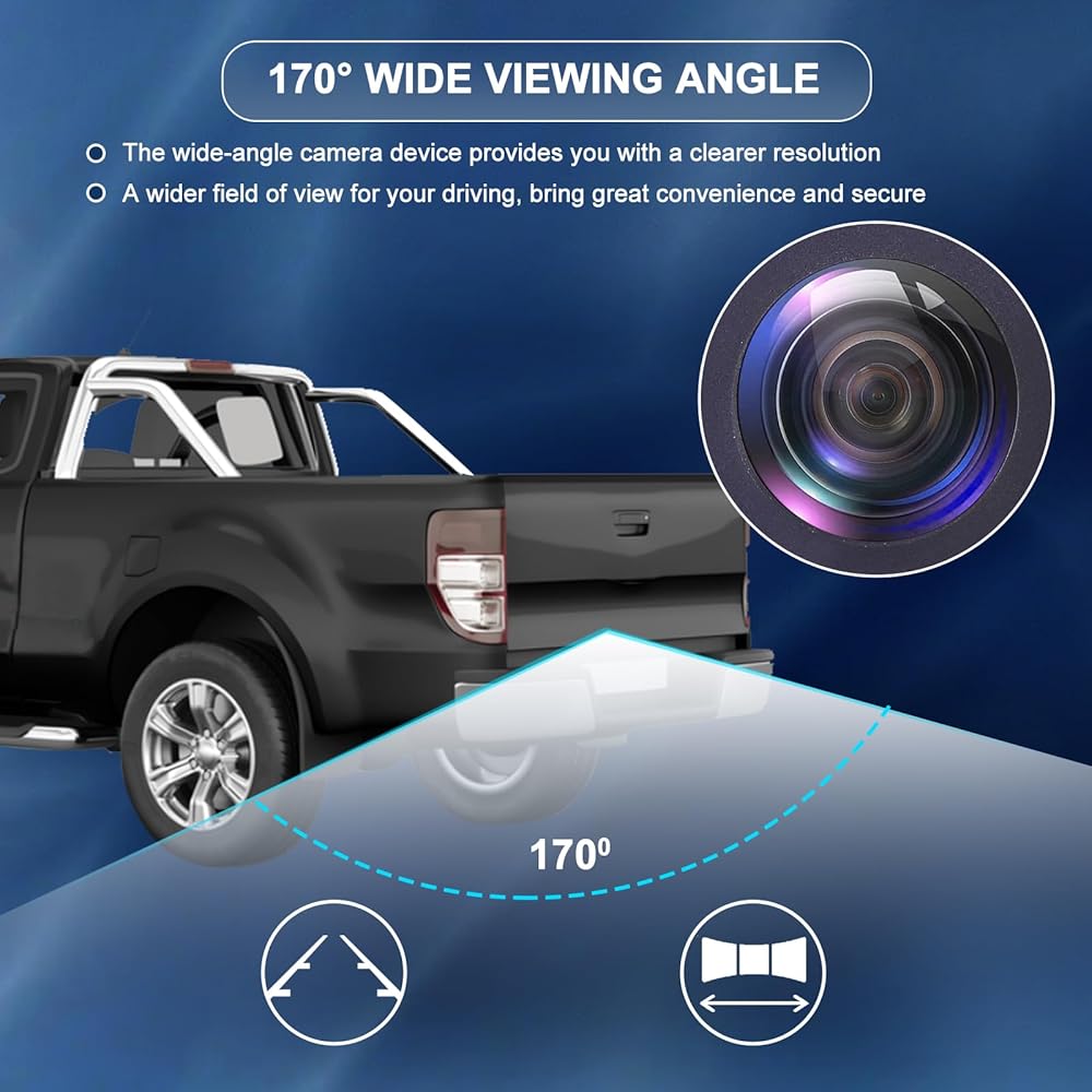 【مريح وعملي】 جهاز الكاميرا الاحتياطي بزاوية 170 درجة يوفر لك مجال رؤية أوسع لقيادتك. في الوقت نفسه ، يحتوي على خط مرجعي عكسي ، مما يتيح لك الانعكاس بسهولة ، مما يقلل مباشرة من خطر الانعكاس. (ملاحظة: يعتمد خط دليل مساعدة وقوف السيارات على ما إذا كانت سيارتك تحتوي على ذلك.)