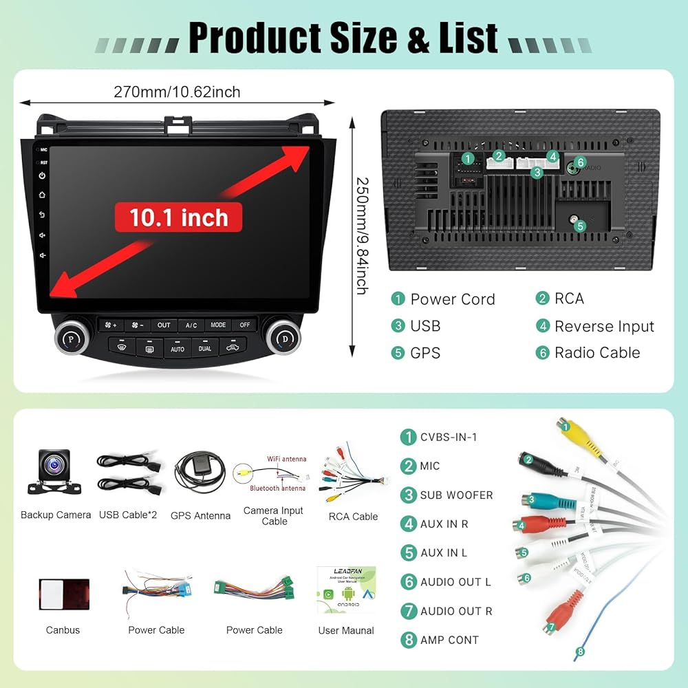 Radio Stereo Stereo Leadfan لـ Honda Accord 7th 2003-2007 Wireless Carplay & Android Auto ، 10.1 "IPS Touch Screen Android Accord Unit WiFi GPS BT FM DSP Camera SWC Mirrorlink