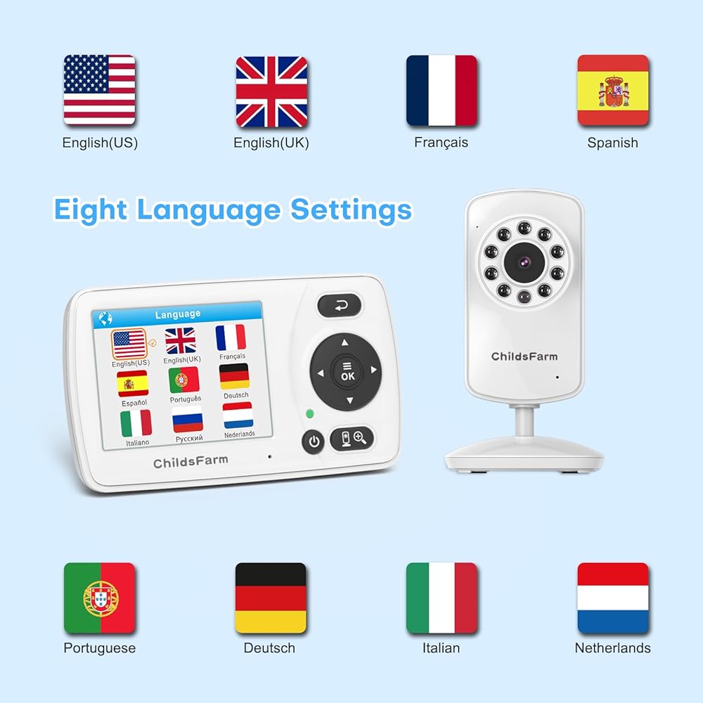【دعم اللغة المتعددة】 يوفر شاشة الطفل هذه مع الكاميرا والصوت دعمًا شاملاً لغوية لاستيعاب أولياء الأمور من خلفيات مختلفة. وهو يدعم اللغة الإنجليزية والإسبانية والفرنسية والألمانية والإيطالية والروسية والبرتغالية والهولندية ، مما يضمن سهولة الاستخدام والفهم لجميع المستخدمين. التعليمات المقدمة واضحة وموجزة بلغات متعددة ، مما يسمح بإعداد سريع لرصد الطفل.