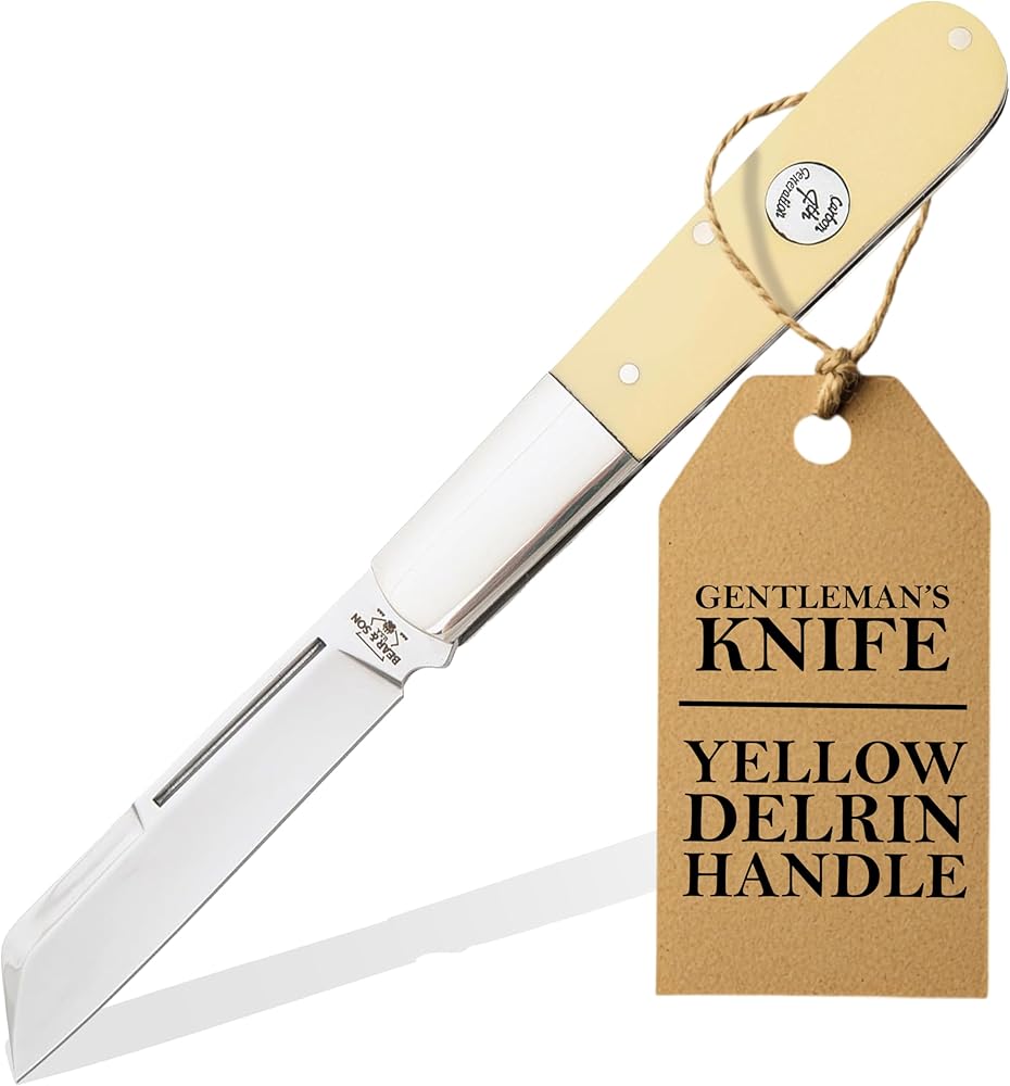 BEAUTIFUL DESIGN - The Yellow Delrin Barlow features a yellow delrin handle, nickel silver bolsters, and taper ground blade. Each knife has a collectors stamp with a dated dotted system, ideal for knife collectors.
