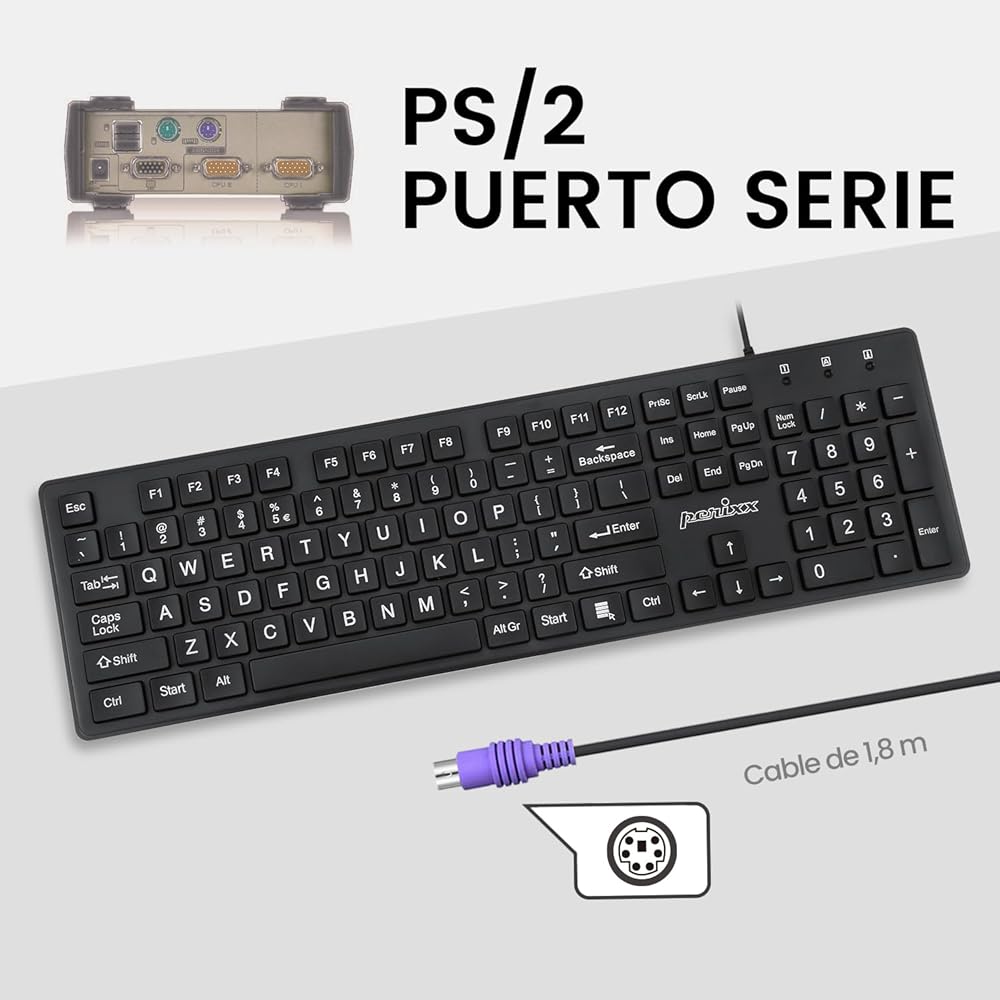 perixx periboard -117p es teclado con cable ps/2 - configuración es y teclas tipo chiclet impresas en grande - negro - Qwerty español