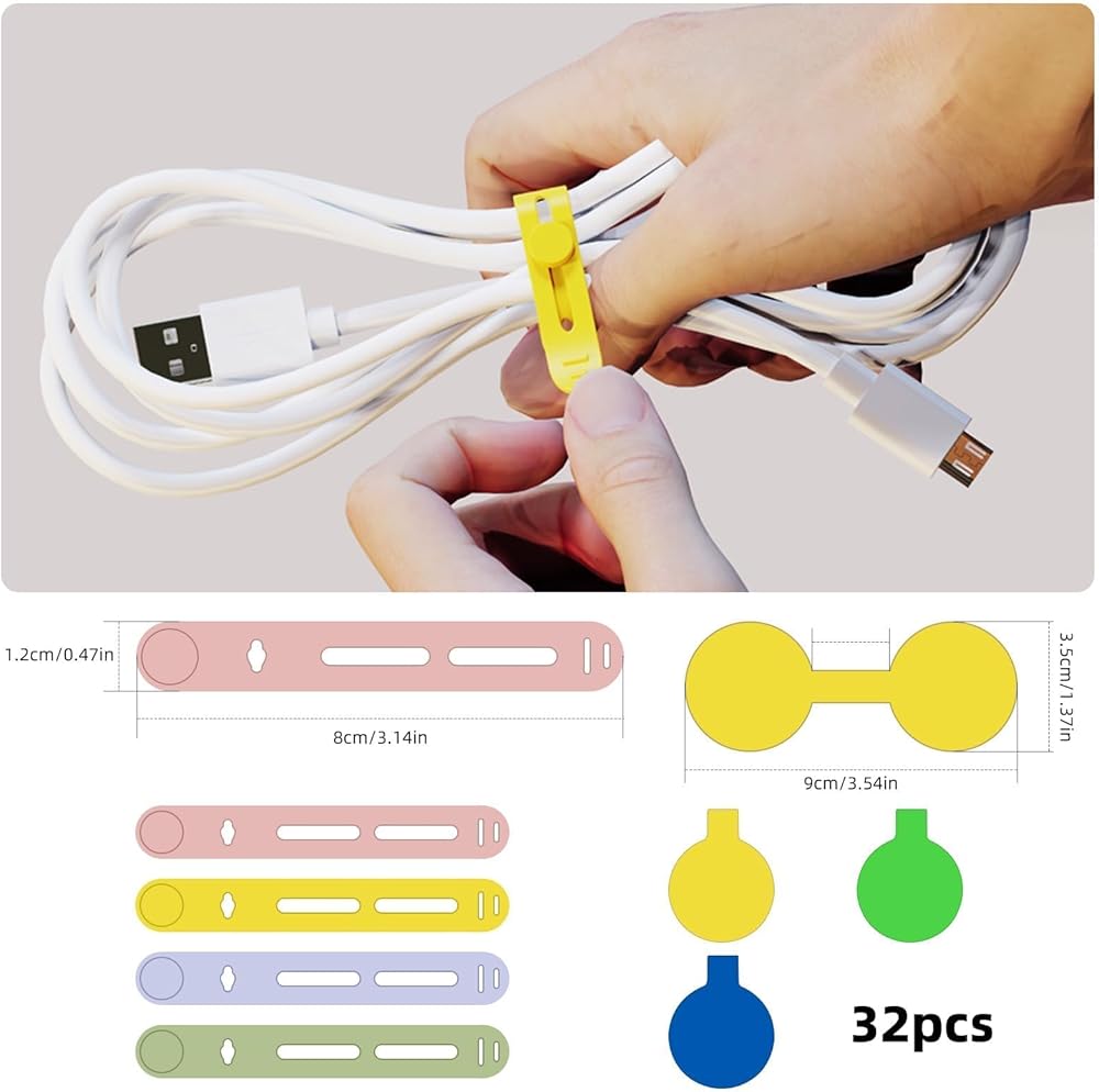 Ultimate Organization: With our set of 32 cord labels, including 5pcs of assorted color cable ties (purple, green, yellow, pink) and 12pcs of 3.5x9cm writable and adhesive round labels, you can effortlessly manage your cables. Each label is designed to clearly identify the purpose of your electronic cords, keeping your workspace tidy and your electronics easily accessible.