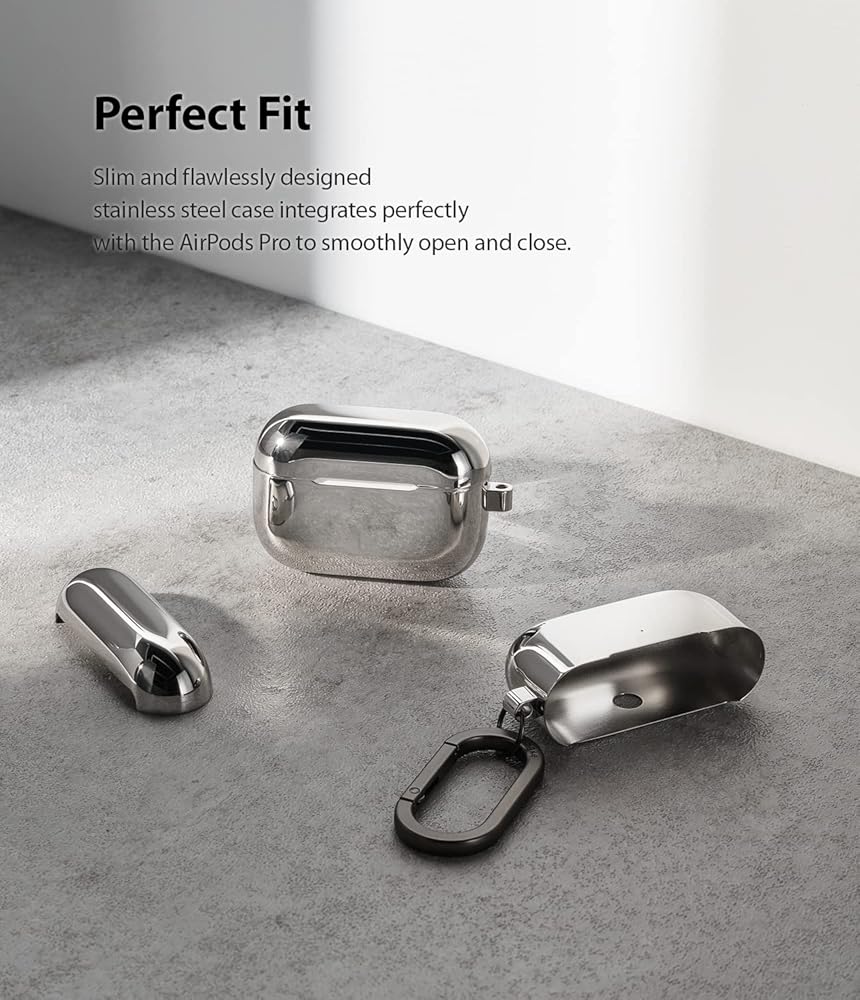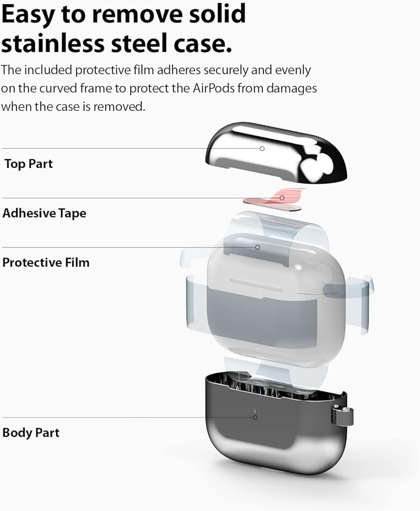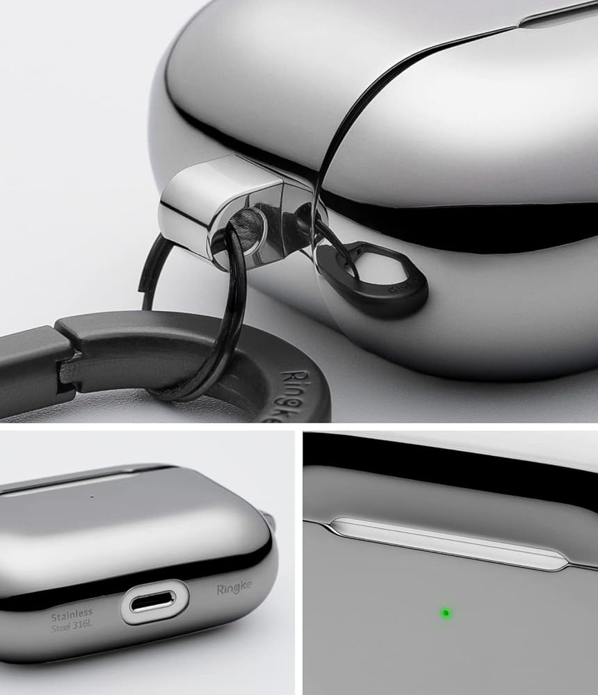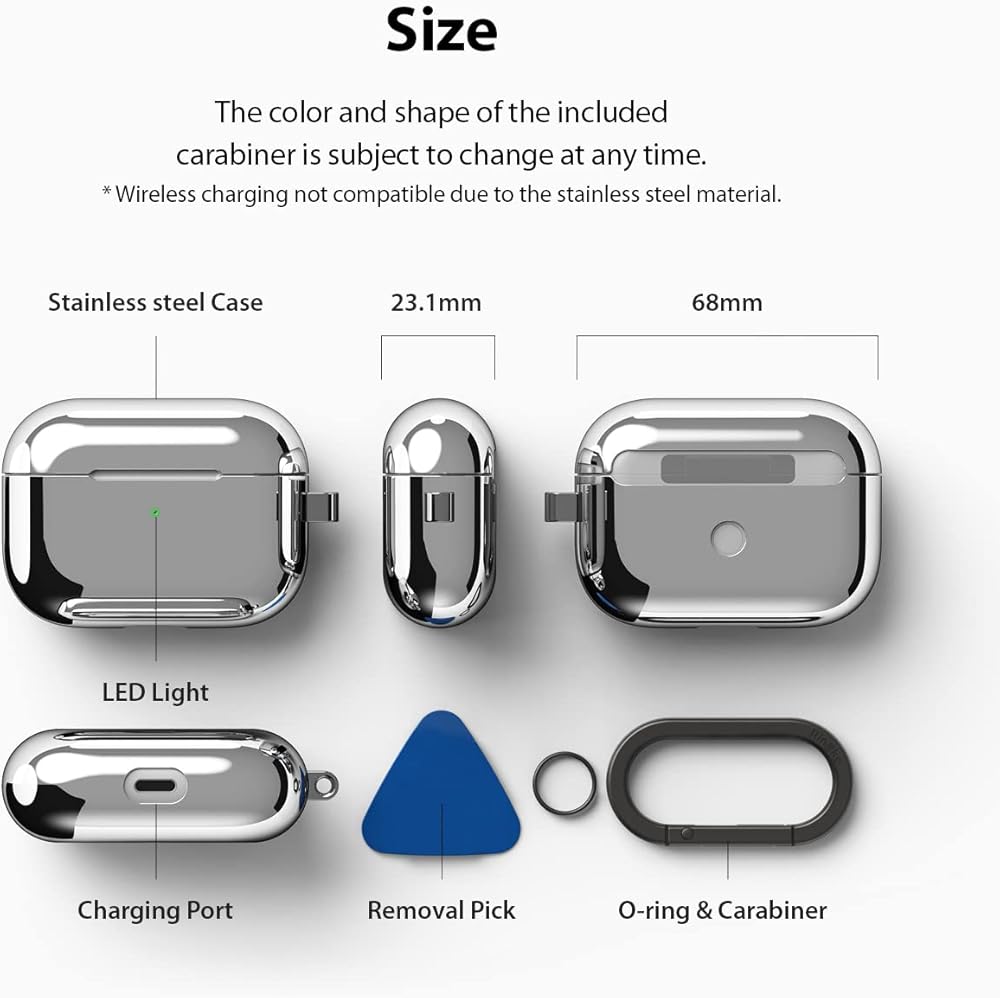 حالة من الفولاذ المقاوم للصدأ Ringke متوافق مع AirPods Pro ، غطاء الفولاذ المقاوم للصدأ اللمعان المتميز مع فيلم واقٍ داخلي ، Keychain Carabiner