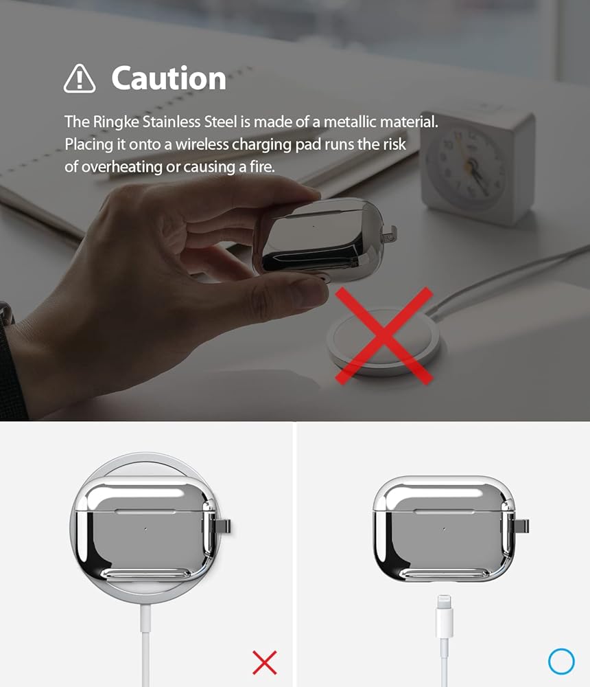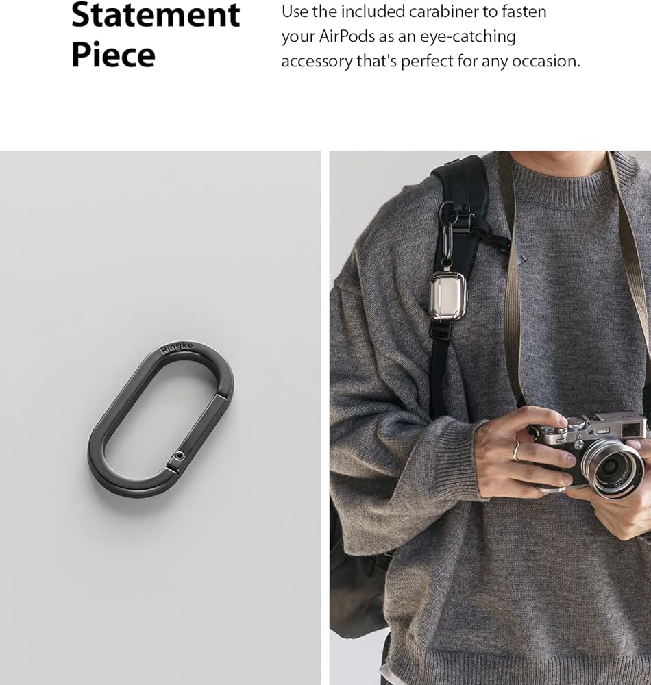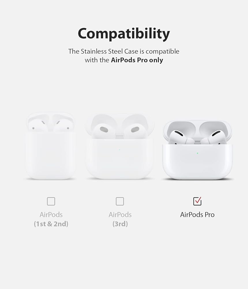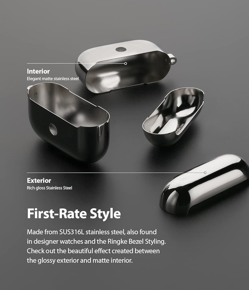 حالة من الفولاذ المقاوم للصدأ Ringke متوافق مع AirPods Pro ، غطاء الفولاذ المقاوم للصدأ اللمعان المتميز مع فيلم واقٍ داخلي ، Keychain Carabiner