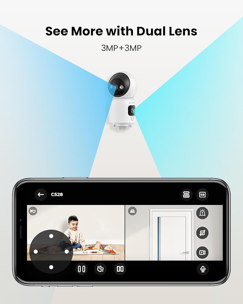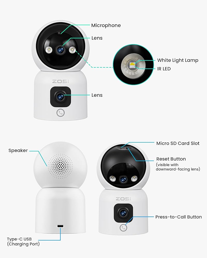 [العدسة المزدوجة والمنظر المزدوج] تم تجهيز الكاميرا الداخلية Zosi 2K مع عدسة الإمالة العليا التي يمكن أن تدور أفقيًا 360 درجة وعمودية 108 درجة ، مما يوفر منظرًا بانوراميًا لمنزلك. لا تضمن العدسة الثابتة السفلية أي بقع عمياء ، لذلك لا تفوتك أبدًا لحظة في الغرفة.