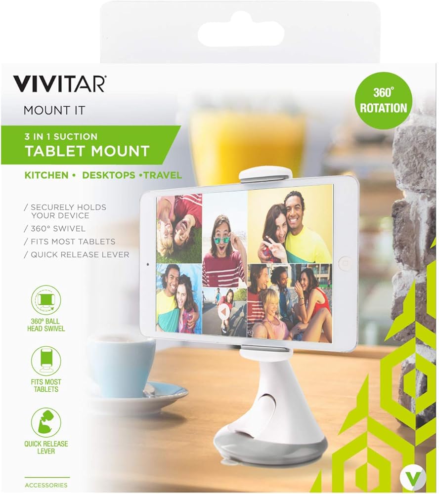 The Vivitar 3-in-1 Suction Tablet Mount is a convenient way to keep your tablet at the perfect viewing angle. The mount securely holds most tablets, mounts securely to most flat surfaces and can swivel 360 degrees. It also has a quick-release lever and is easy to move and re-stick as you please. Go hands-free, reduce eye and neck strain, and make browsing on your tablet a breeze.