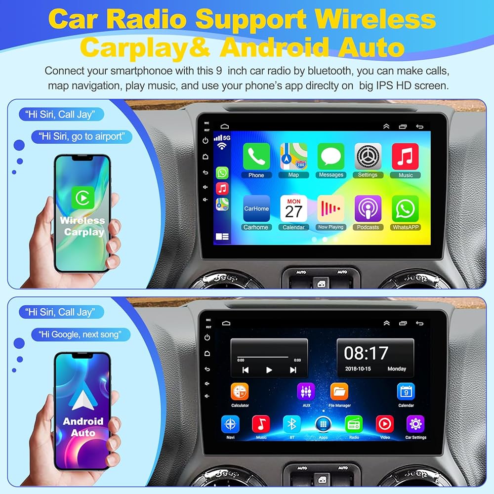 【Carplay Wiredely Wired Carplay & Android Auto】 ، يمكن لراديو مشغل سيارة Jeep Wrangler/ Grand Cherokee/ Dodge Ram/ Chrylser متوافقًا مع IOS Carplay و Android Auto يمكنه السماح لك باستخدام هاتفك على الشاشة الكبيرة سلسة ، يمكنك إجراء مكالمات مجانية مع مساعدة Siri أو Goo-bed مساعدة ، من السهل الحصول على جهات اتصال هاتفية ، ورسائل البريد الإلكتروني ، والإشعارات ، والتنقل في الخريطة ، والموسيقى ، ومقاطع الفيديو ، والمزيد. وهذا يعني أنه يمكنك التركيز أكثر على السلامة على الطرق أثناء القيادة!