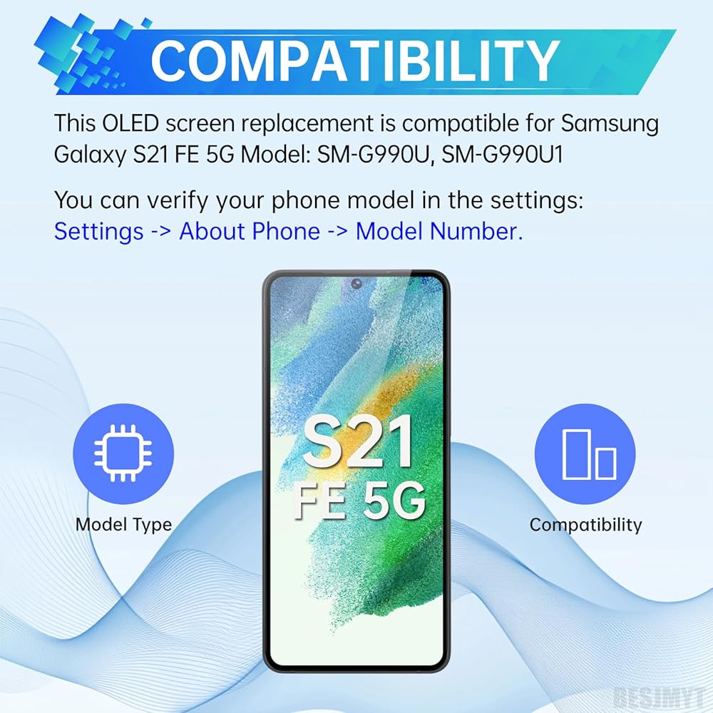توافق الشاشة: هذا استبدال شاشة OLED متوافق مع Samsung Galaxy S21 Fe 5G SM-G990U SM-G990U1 تحقق من رقم الطراز قبل الشراء. ابحث عن تفاصيل النموذج الخاصة بك: الإعدادات -> حول الهاتف -> اسم الطراز/رقم الطراز.