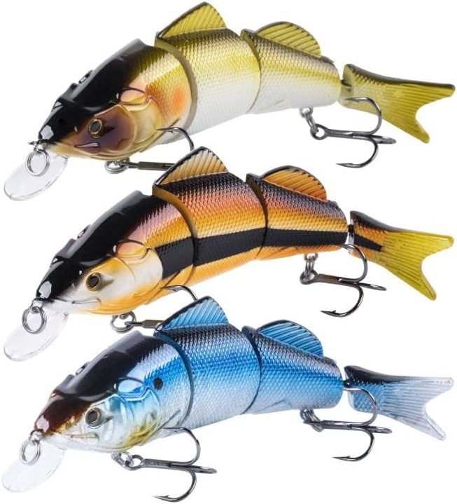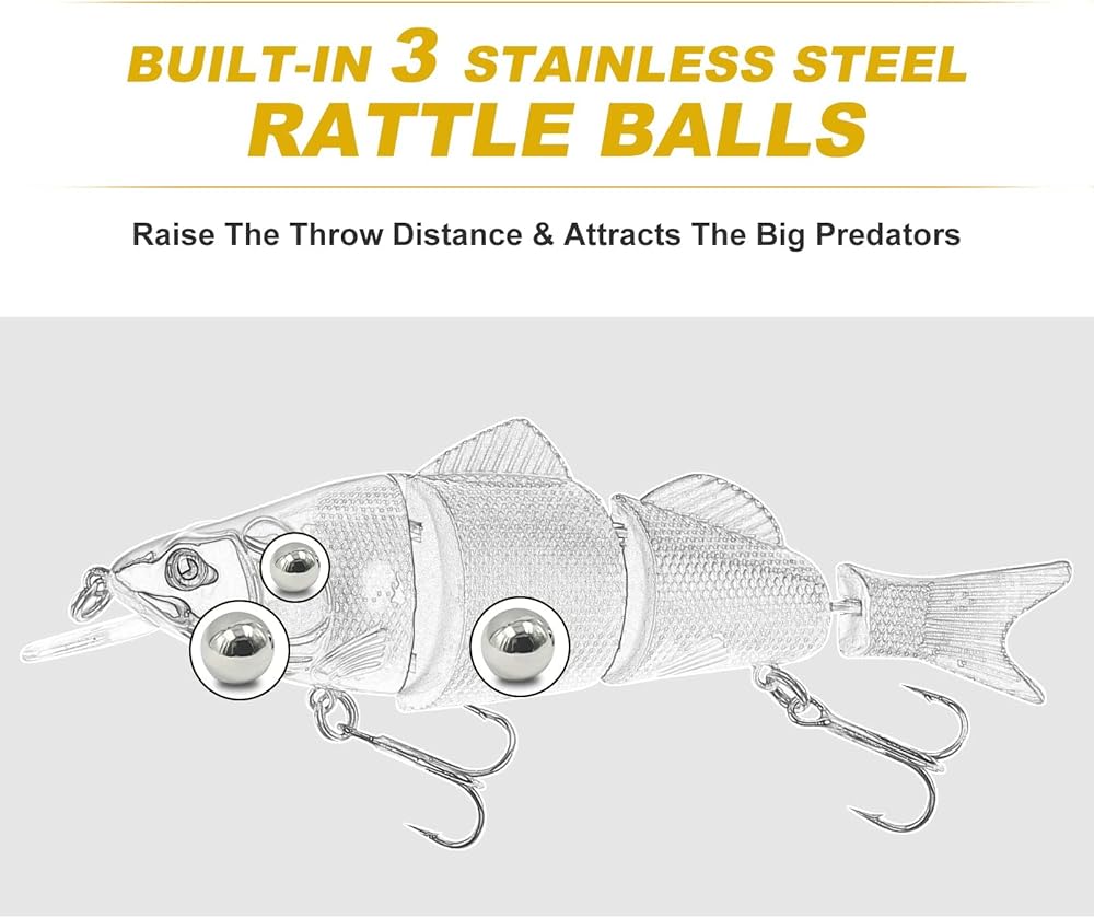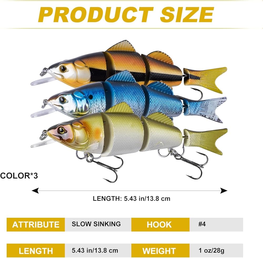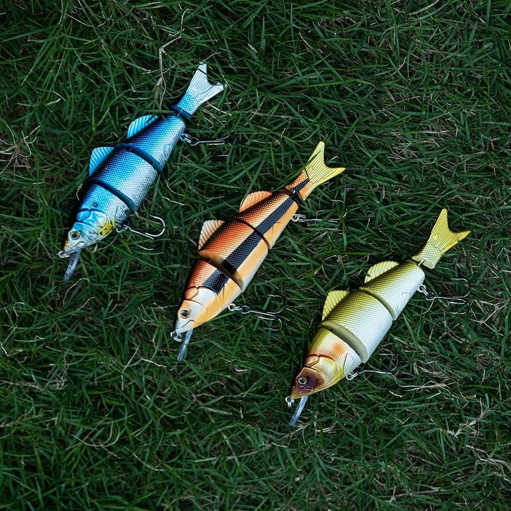 Swimbait متعددة المفصلات: تتصل أقسام الجسم المختلفة بمساعدة المعدن ، مما يضمن أن إغراء الصيد يمكن أن يقاوم لدغة قوية من الأسماك الكبيرة مع كسر أو تلف. الخطاف الثلاثي الحاد يسمح باختراق أفضل